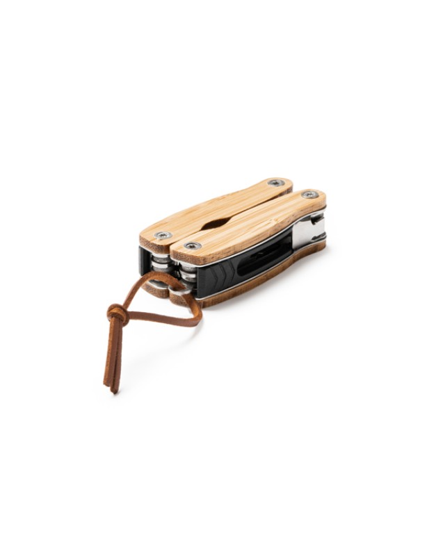 Utensile multiuso con corpo e accessori in acciaio inox e impugnatura in bambù. 12 funzioni: rasoio, sega, lima, apripista, cacciavite e pinze. Include tracolla per il trasporto. - Misure: [5cm/1,7cm/10,5cm] - Composizione: Acciao inossidabile e bambú - Confezione in scatola ecologica.