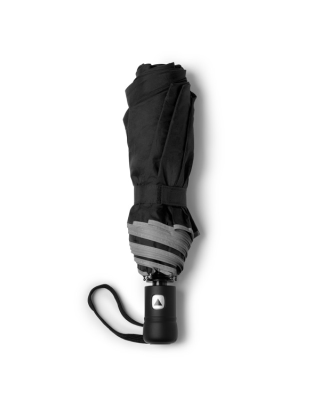 Ombrello realizzato in RPET (poliestere riciclato) con tessuto pongee 190T e rifinito con bande riflettenti è un'opzione durevole e sostenibile per proteggersi dalla pioggia. Il tessuto in pongee 190T è resistente e idrorepellente e garantisce una buona protezione dalla pioggia. Le bande riflettenti aggiungono un elemento di sicurezza in quanto riflettono la luce e aumentano la visibilità in condizioni di scarsa visibilità.Le aste in fibra di vetro con sistema antivento offrono maggiore resistenza e flessibilità alle raffiche di vento, evitando che l'ombrellone si danneggi facilmente. Inoltre, l'ombrello è dotato di un pulsante di apertura automatica per un facile utilizzo e di una chiusura in velcro per una conservazione sicura.Include una fodera coordinata per riporre l'ombrello quando non viene utilizzato, mantenendolo protetto e in ordine. Realizzato in RPET, questo ombrello contribuisce alla riduzione dei rifiuti grazie all'utilizzo di materiali riciclati nella sua produzione. - Misure: [56cm/110Ø] - Composizione: RPET.