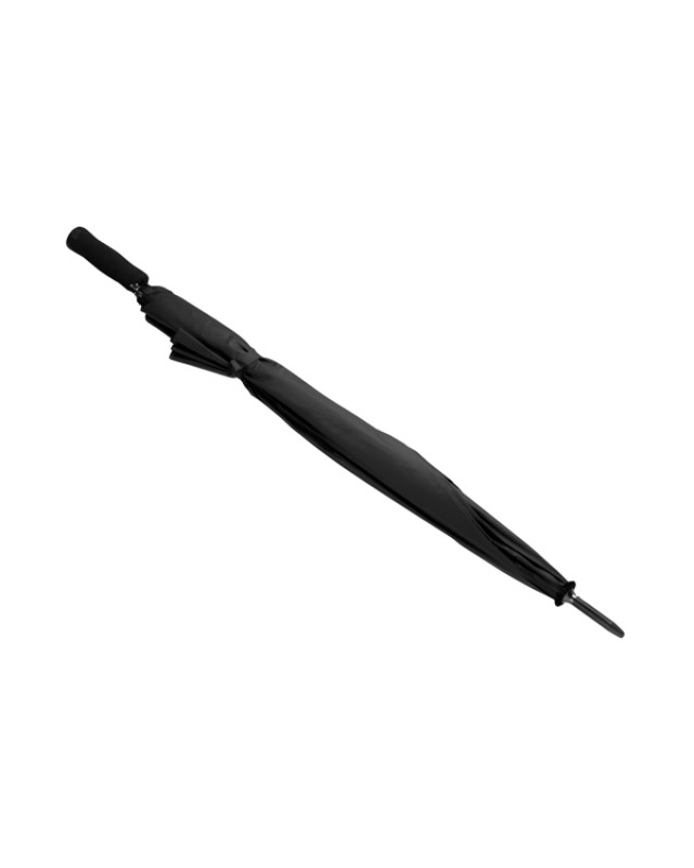 Ombrello XL con manico, canna e finitura nera. Costole lunghe in fibra di vetro. Pulsante di apertura automatica. Impugnatura diritta in gomma EVA. Chiusura a velcro in tinta con il tessuto dell'ombrello. Diametro 130 . - Misure: [98cm/130Ø] - Composizione: Poliestere 190T, gomma EVA, fibra di vetro e metallo.