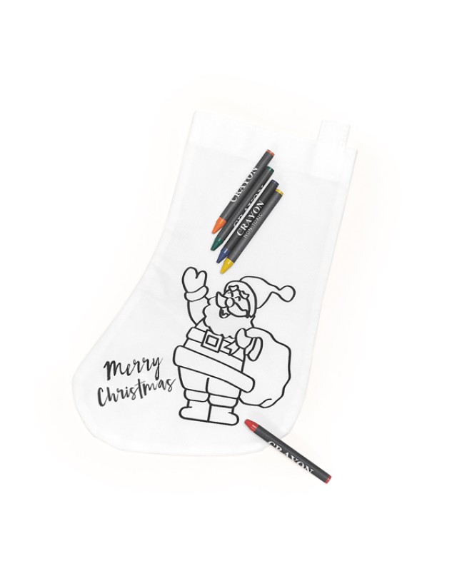 Calzino con divertente disegno natalizio da colorare. Include 5 cere colorate: blu, rossa, nera, gialla e verde. - Misure: [29,5cm/19cm] - Composizione: TNT da 80gr