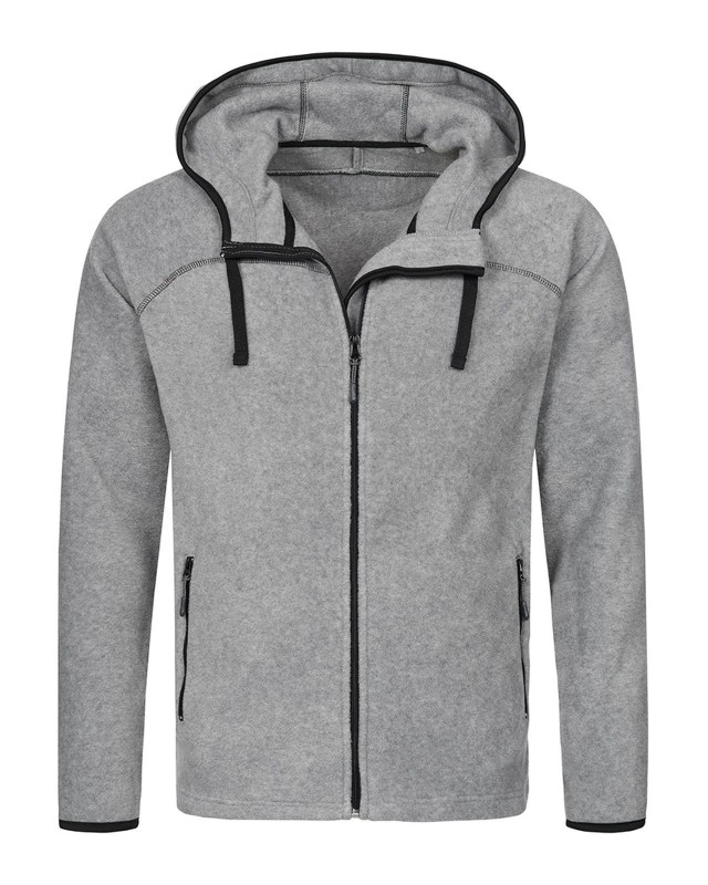 100% poliestere anti-pilling. Pile maniche raglan, struttura con cuciture laterali. cappuccio tipo sub con cordoncini piatti e cerniera in contrasto, due tasche laterali con zip, bordo in poliestere in contrasto cromatico.