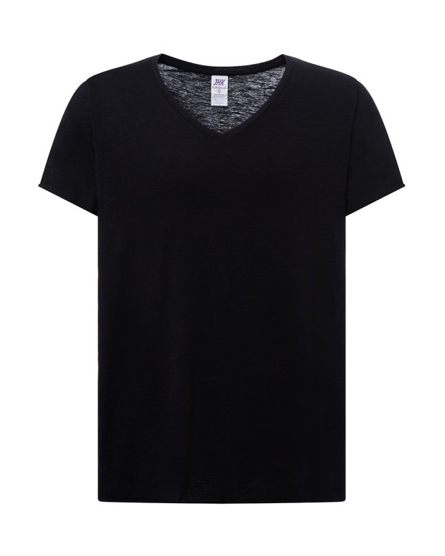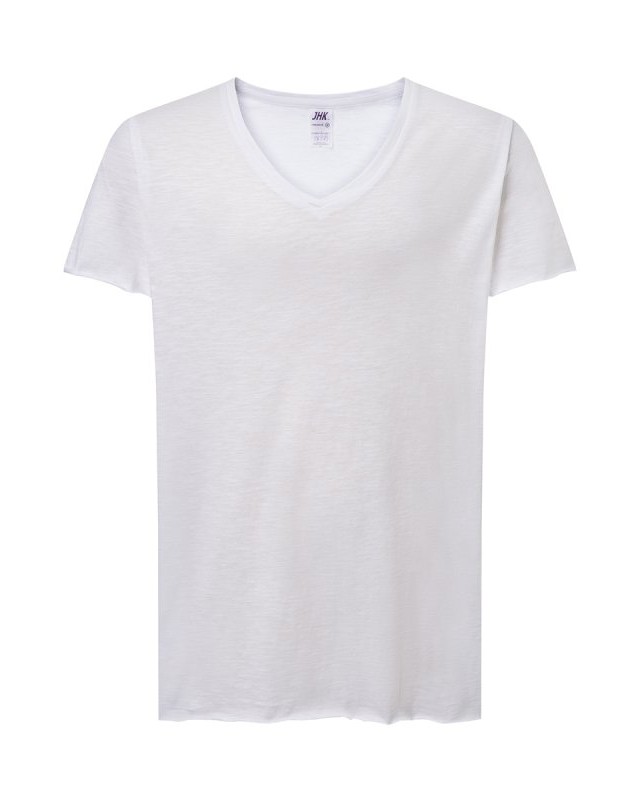 Tessuto fiammato; Forma svasata; Collo a V; Bordo grezzo su maniche e fondo; Etichetta rimovibile; 100% Cotone Composizione: 100% cotone. Peso: 120 gr/m2. Vestibilità: ampia. Busto: cuciture laterali. Etichetta: rimovibile.
