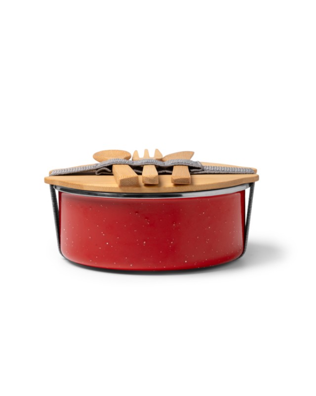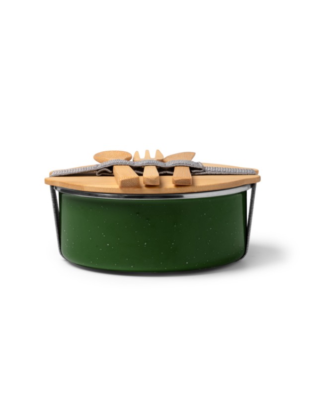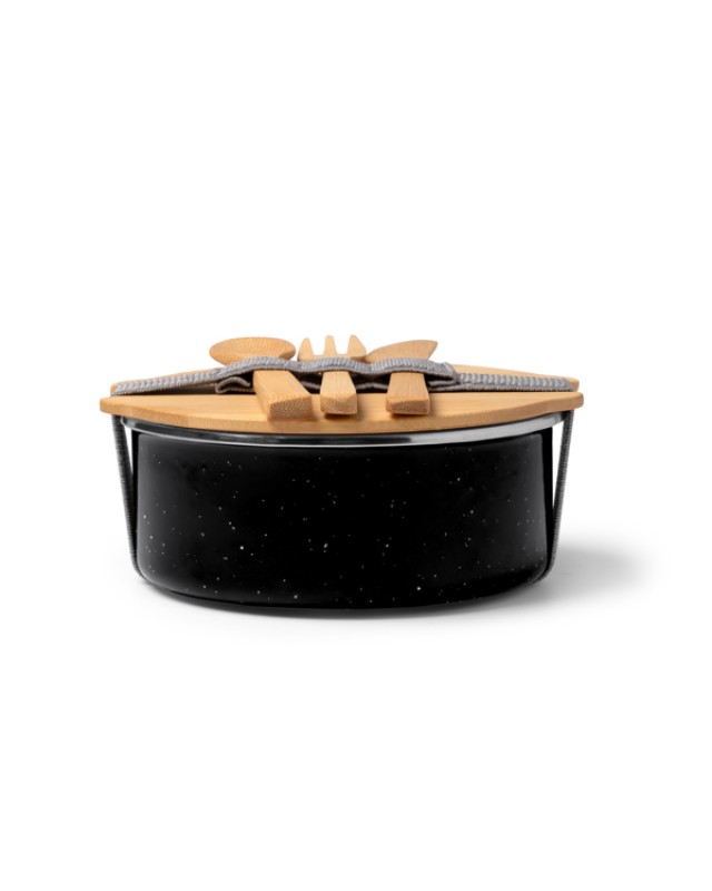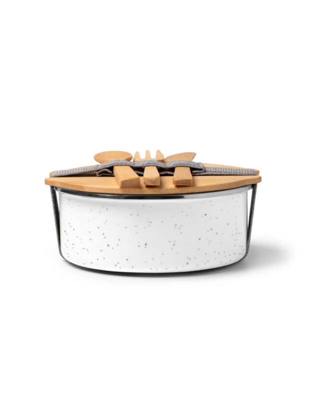 Il portapranzo in metallo è dotato di un resistente rivestimento in ceramica e di un coperchio in bambù fissato con un elastico per mantenere il cibo al sicuro. Include un pratico set di posate in bambù. Con una capacità di 750 ml, è ideale per trasportare pranzi sani e sostenibili. Questo design combina eleganza e funzionalità, perfetto per l'uso in ufficio, a scuola o ovunque sia necessario un pasto pratico. - Composizione: Ceramica e bambù - Misure: 15,4cm/6,8cm