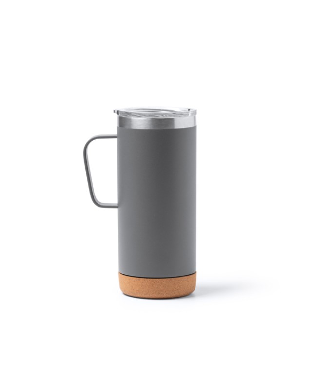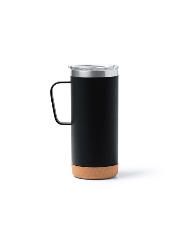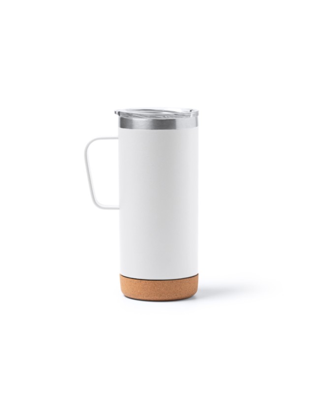 Tazza in acciaio inox a doppia parete con fondo in sughero e coperchio di sicurezza trasparente. Capacità 600 ml. - Misure: 11cm/18,5cm/8cm