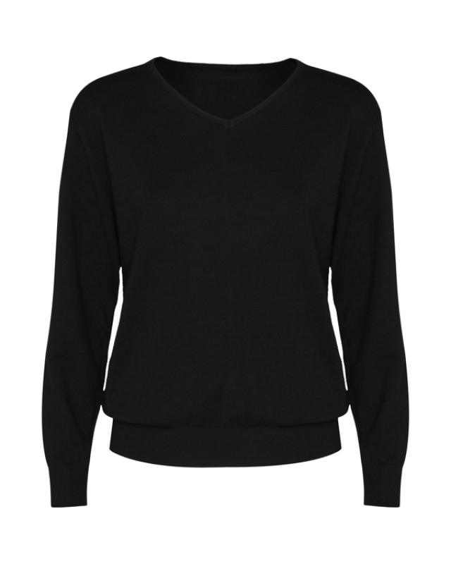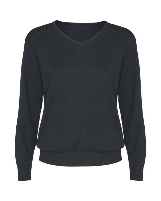 Maglioncino da donna a tessitura fine con scollo a V. Collo, polsini e orlo a costine tono su tono 1x1. - Genere: Donna - Composizione: 50% viscosa / 28% poliestere / 22% poliammide, GG12 - Misure: 48cm/58cm