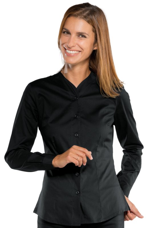 La camicetta Zefiria è una camicia da donna a manica lunga nero. Ideale per settore alberghiero, ristorazione. divisa da lavoro per bar, pub, ristoranti, alimentari. con rouches e con bottoni a vista, modello sciancrato. Cotone Spandex - Stretch Manica Lunga. Peso: 136 Gr/m². Composizione: 97% Cotone 3% Spandex - Stretch