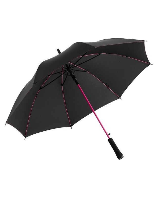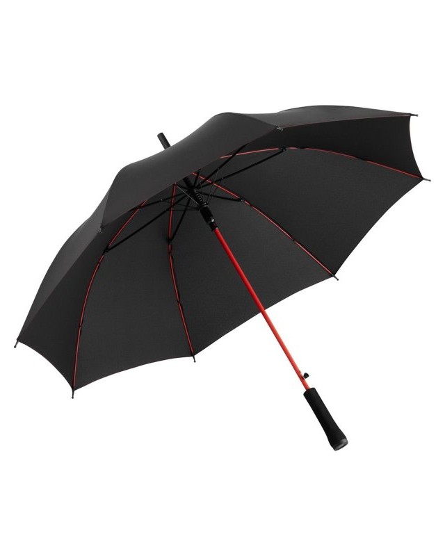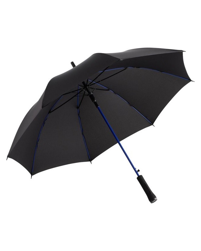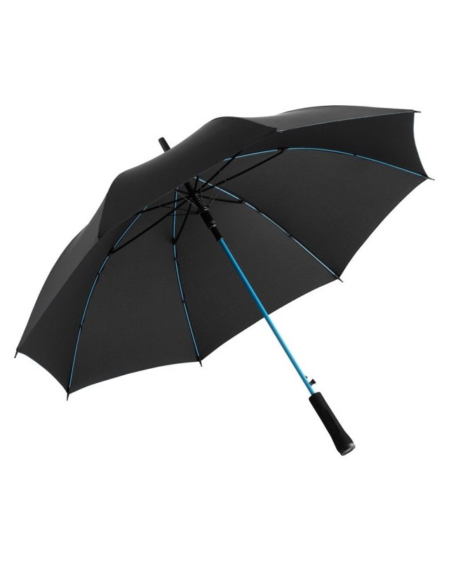 Ombrello bastone con funzione automatica per una apertura rapida. Struttura antivento per una maggiore flessibilità e stabilità in condizioni ventose. Stecche flessibili in fibra di vetro. Robusto fusto in acciaio con manicotto colorato, manicotto colorato, materiale in poliestere pongee certificato Standard 100 by OEKO TEX in plastica riciclata. Ecologico grazie al rivestimento waterSAVE, sottile decorazione del rivestimento grazie alle cuciture colorate, esclusiva impugnatura morbida con doppia possiblità di personalizzazione. Anche il pulsante di apertura ha la possibilità di essere personalizzato.