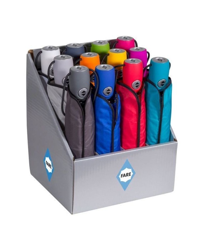 100% carta. Espositore per un massimo di 12 mini ombrelli, cartone plastificato e argentato con logo FARE, divisione 4x3, adatto per ombrelli con diametro chiuso fino a ca. 5,5 cm. Larghezza: 24 cm, altezza: 28 cm, profondità: 20 cm.
