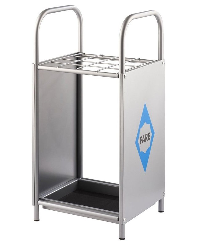 100% acciaio. Espositore per un massimo di 16 ombrelli regolari, telaio in alluminio, rivestimento color argento, chiusi ai lati e con logo FARE, montaggio incl. base antiscivolo. Larghezza: 26 cm, altezza: 60 cm, profondità: 29 cm.