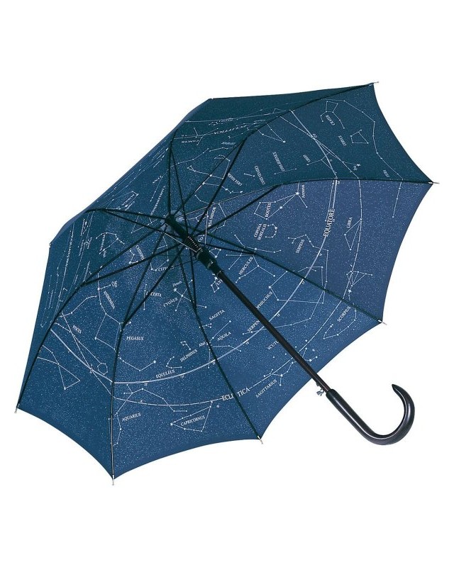 Fodera interna con stelle rappresentate su tutta la superficie, confortevole funzione automatica per un'apertura rapida, stecche in fibra di vetro stabile, proprietà Windproof per un'elevata stabilità del telaio e migliore resistenza al vento, bastone e manico a uncino tondeggiante in vero legno, dal bellissimo aspetto. Diametro: 105 cm, lunghezza da chiuso: 89 cm.