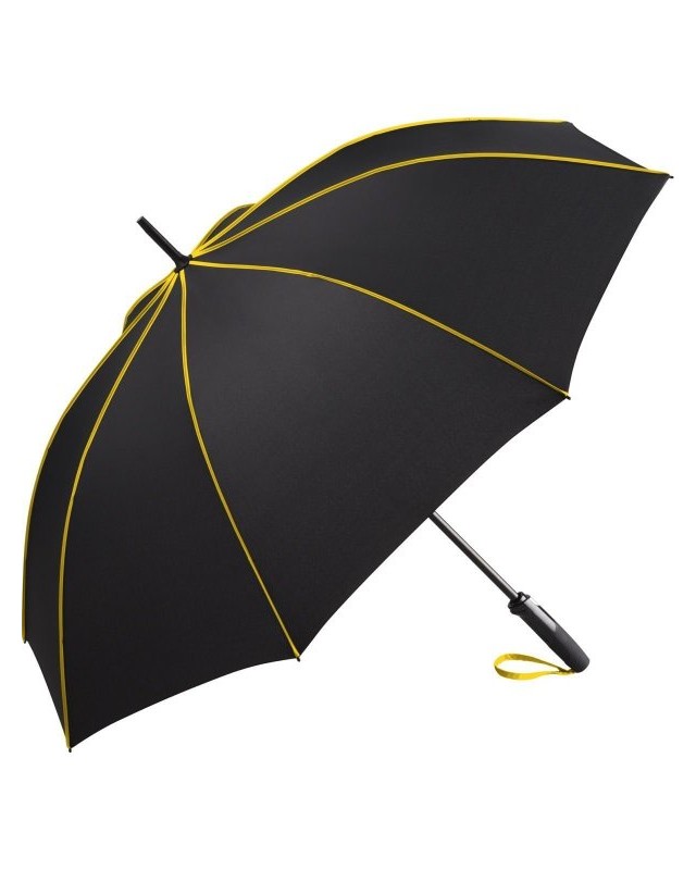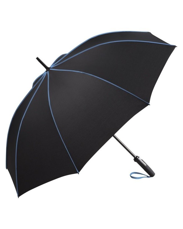 Copertura: 100% poliestere, manico: plastica, asta: acciaio, plastica. Ombrello di media misura con apertura automatica, bacchette flessibili in fibra di vetro, pannelli di colore nero con bande in contrasto colorate, manico nero soft-touch. Diametro: 115 cm, lunghezza da chiuso: 90 cm, 8 pannelli.
