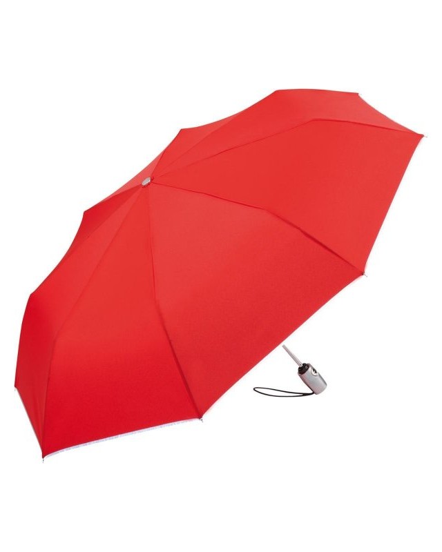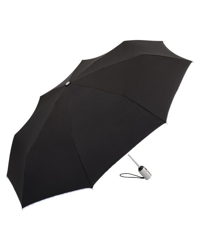 Bordatura Reflex conf. a EN ISO 20471 per una migliore visibilità nel traffico, stecche in fibra di vetro flessibili, confortevole doppia funzione automatica per un'apertura e chiusura rapida, pregiato sistema Windproof per una flessibilità massima del telaio in caso di forti raffiche di vento, manico con finitura in alluminio con pulsante di azionamento piatto con possibilità di applicazione della pubblicità. Diametro: 105 cm, lunghezza da chiuso: 30 cm, 8 pannelli.