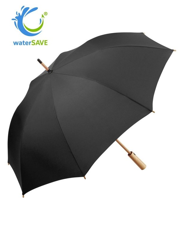 Copertura: 100% poliestere pongee, manico: bambù, asta: bambù. Ombrello con meccanismo automatico di apertura, sistema windproof, stecche flessibili in fibra di vetro, fodera in plastica riciclata WaterSAVE certificata OEKO-TEX, punte e impugnatura in bambù con pulsante nero e possibilità di personalizzazione. Diametro: 112 cm, lunghezza da chiuso: 88 cm, 8 pannelli.