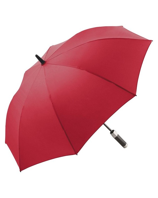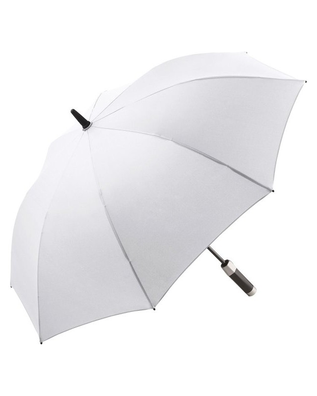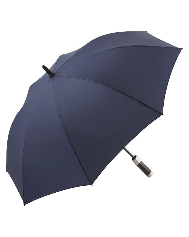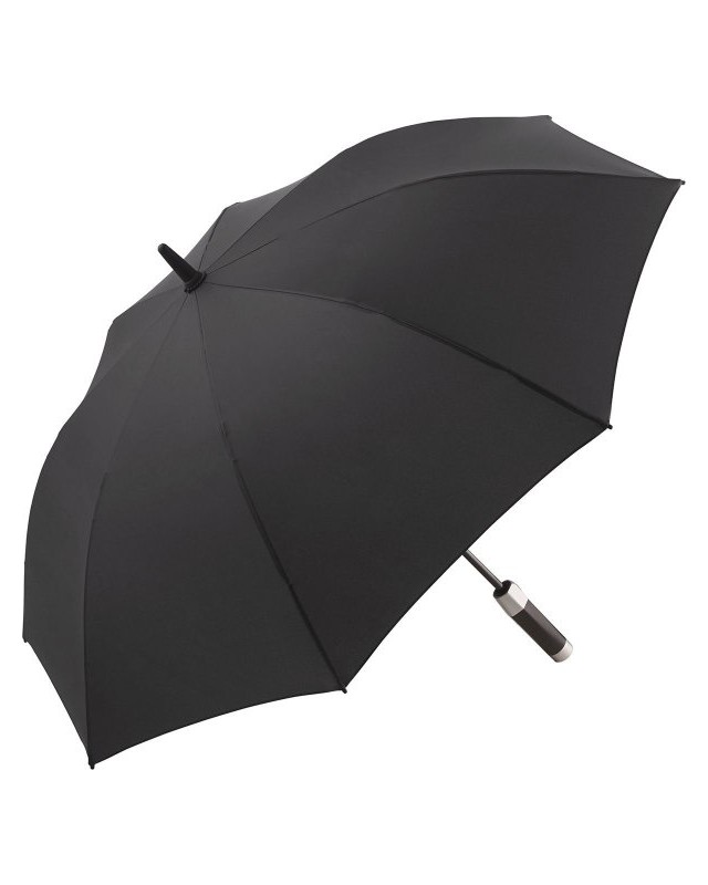 Copertura: 100% poliestere, manico: plastica, asta: acciaio. Ombrello di media misura con apertura automatica, bacchette flessibili in fibra di vetro, sistema Windproof, manico nero soft feel bicolore con tasto di azionamento integrato e casse per la riproduzione dei loghi audio.