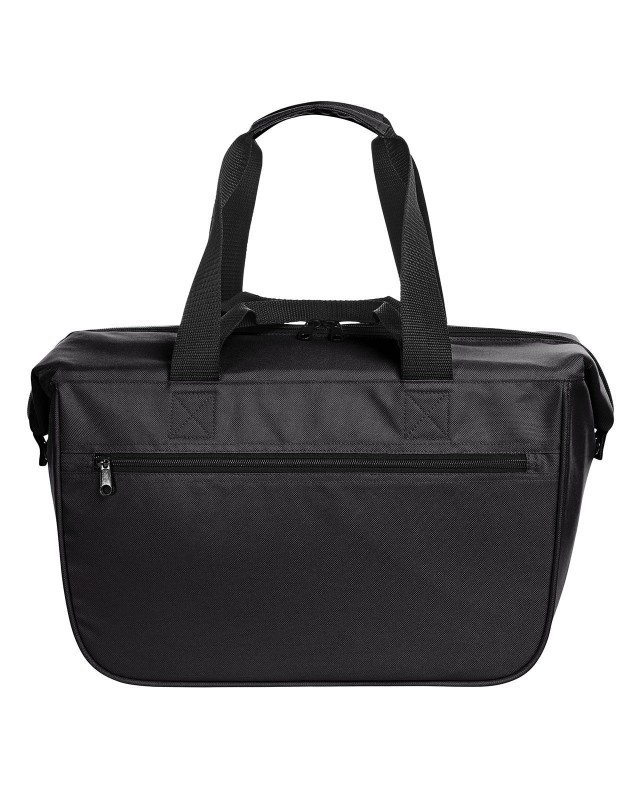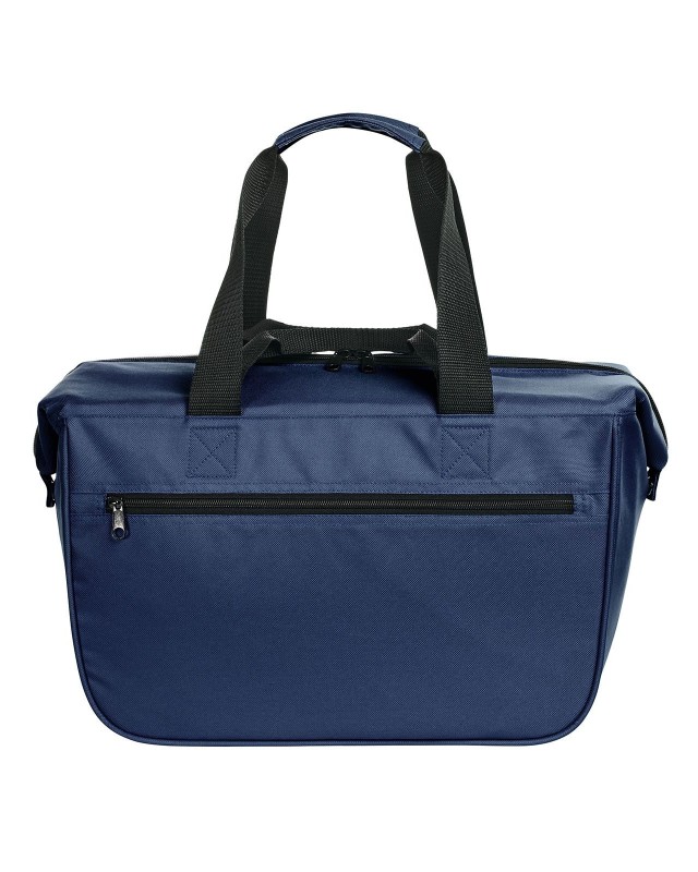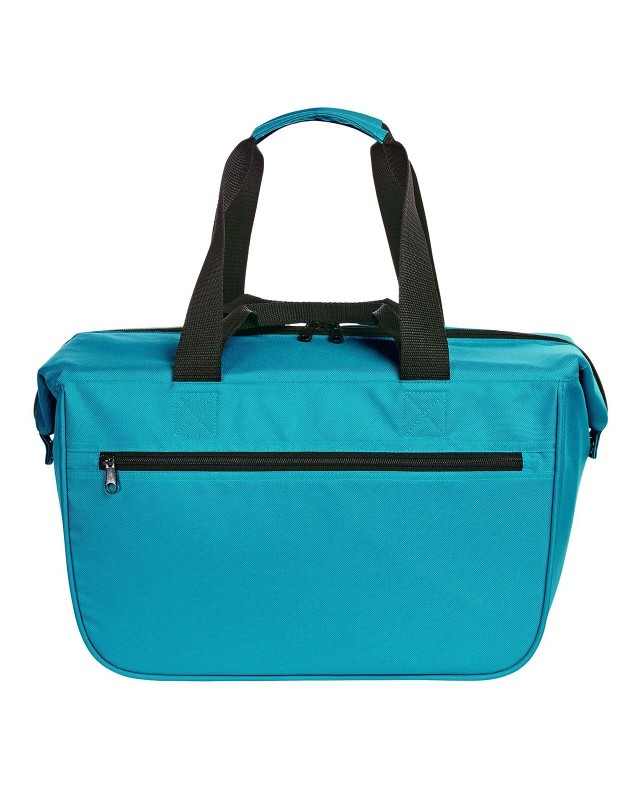 RPET 600d. Poliestere 600d. Innovativa borsa frigo flessibile , ampio scomparto con chiusura lampo bidirezionale, volume ampliabile mediante linguette laterali con bottoni, tasca anteriore con chiusura lampo, lavabile internamente, sistema di supporto con doppi manici e manicotto imbottito per un miglior comfort.