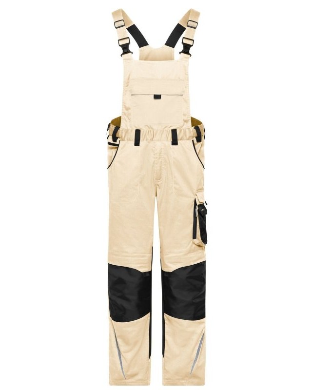 65% poliestere riciclato, 32% cotone organico, 3% elastan. Inserti: 100% poliammide. Salopette da lavoro, resistente, tessuto elasticizzato. girovita elastico con passanti per cintura, tasche imbottite sulle ginocchia rinforzate con CORDURA®, cuciture triple, tasche porta-attrezzi, 2 tasche con zip, dettagli riflettenti (no DPI), zip: YKK.