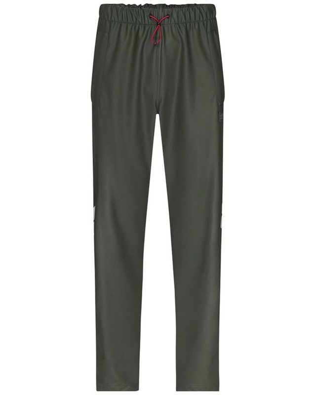60% poliestere 40% poliuretano. Pantaloni vestibilità unisex antipioggia e antivento (10,000 mm colonna d'acqua). Cuciture nastrate, cintura elasticizzata regolabile con cordino, aperture laterali per accedere agli indumenti indossati, zip nascoste sui lati per indossare i pantaloni senza togliere le scarpe, orli regolabili con velcro. Elementi riflettenti (senza funzione protettiva / senza DPI) sulle gambe e sugli orli.