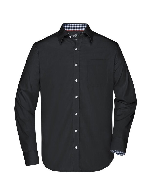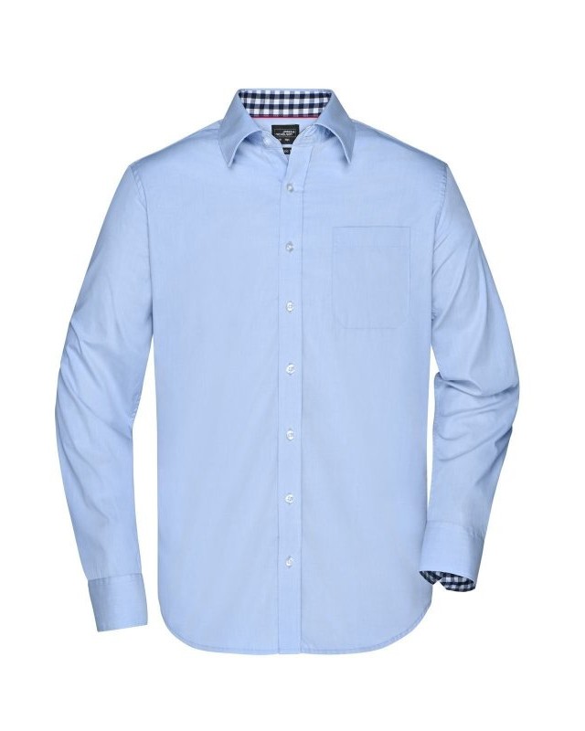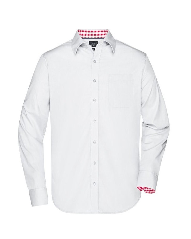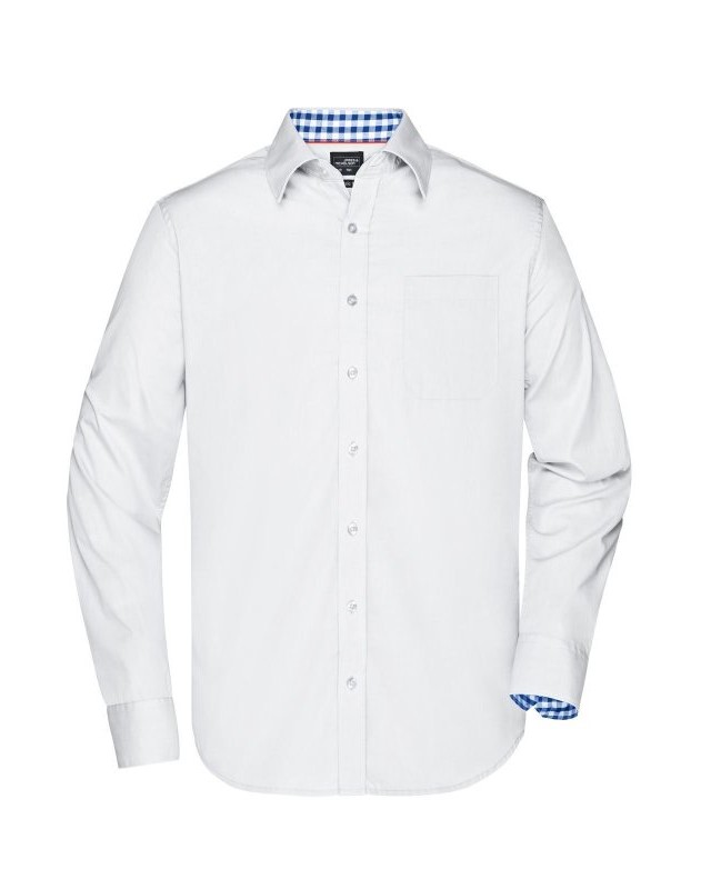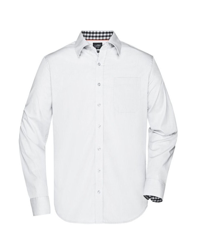 100% cotone. Camicia uomo a maniche lunghe con parte interna del colletto e dei polsini contrastante con disegno a quadretti, taglio classico, taschino lato cuore.