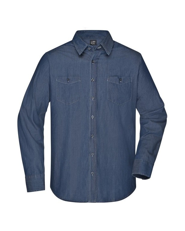 100% cotone pettinato. Camicia uomo in tessuto denim, sprone classico sul retro, due taschine interne, impunture marcate, orlo arrotondato.