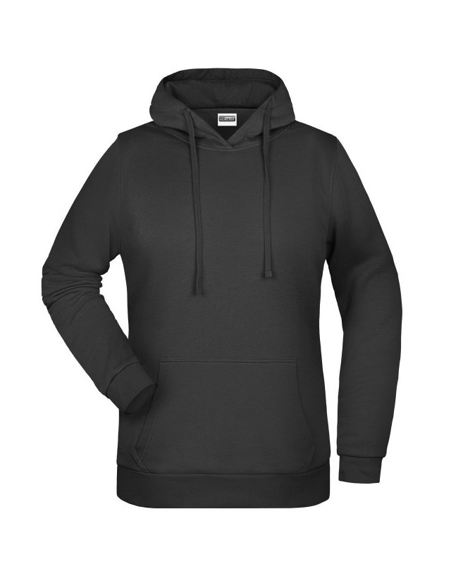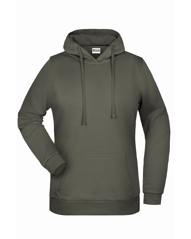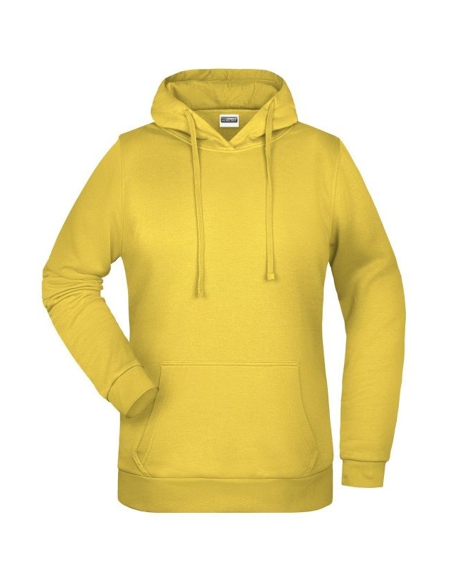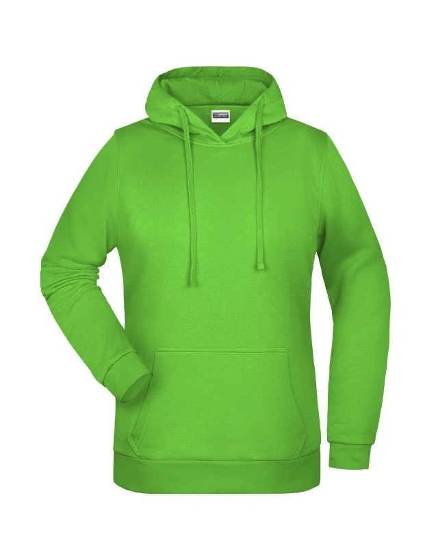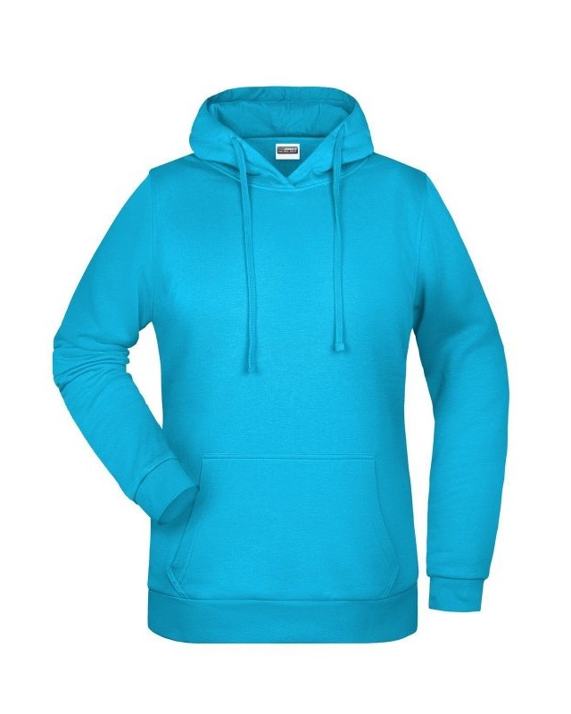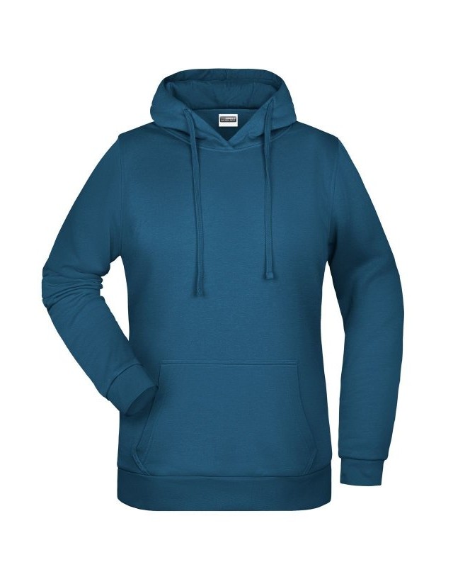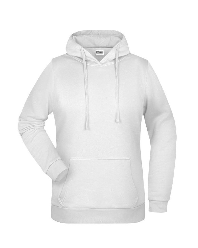 80% cotone, 20% poliestere. Felpa da donna felpata internamente, cappuccio doppio strato con coulisse, tasca a canguro, banda parasudore nel colletto, polsini con elastane. Leggermente sfiancata, etichetta strappabile.
