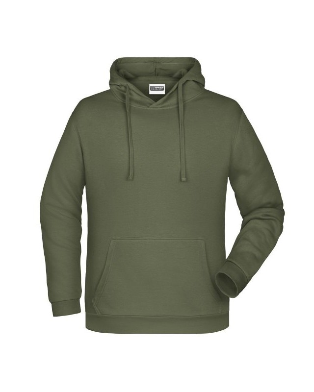 80% cotone, 20% poliestere. Felpa da uomo felpata internamente, cappuccio doppio strato con coulisse, tasca a canguro, banda parasudore nel colletto, polsini con elastane. Etichetta strappabile.