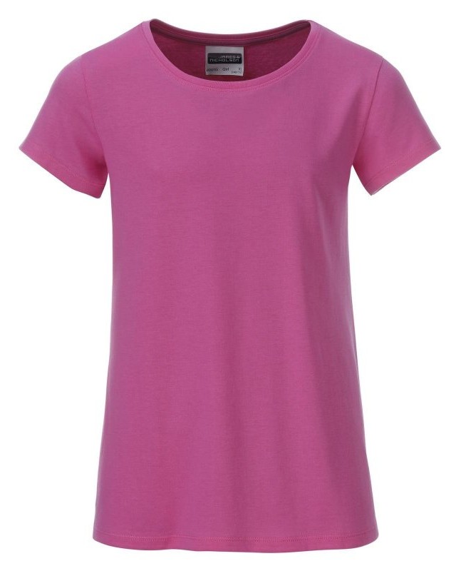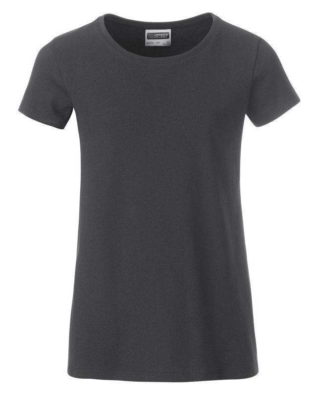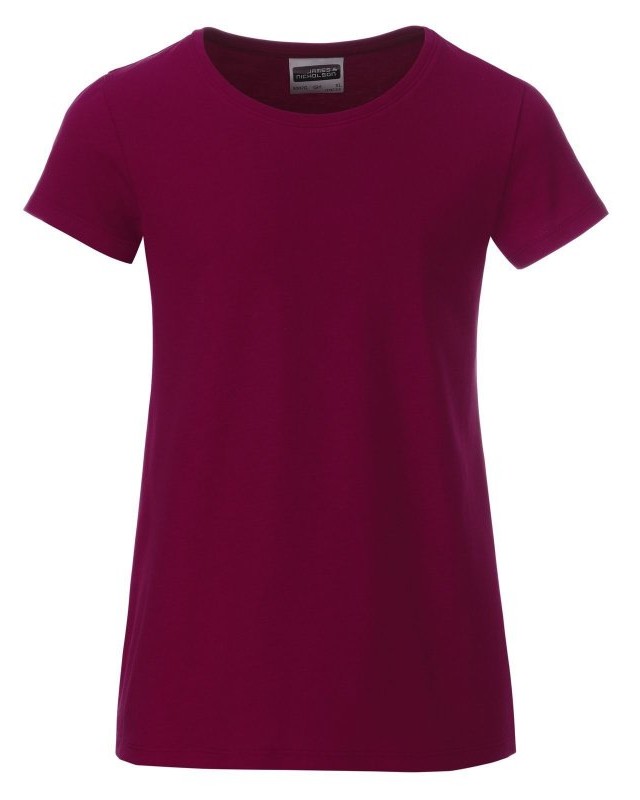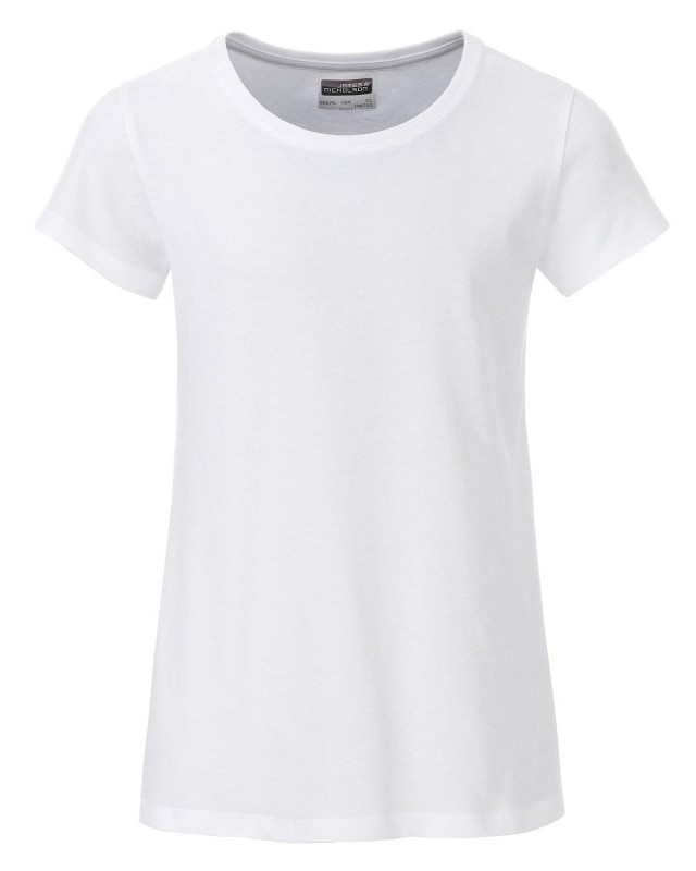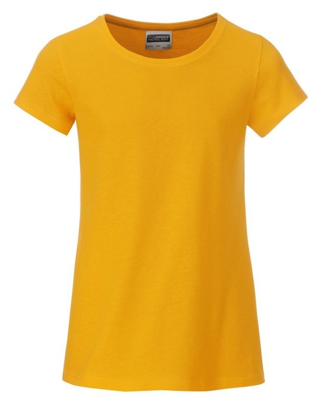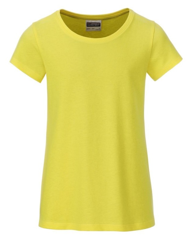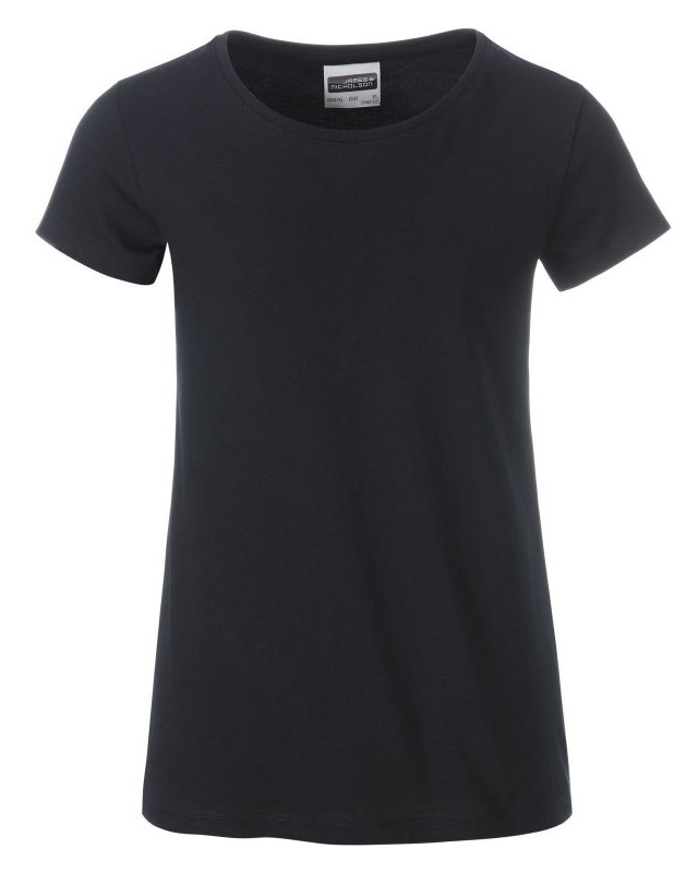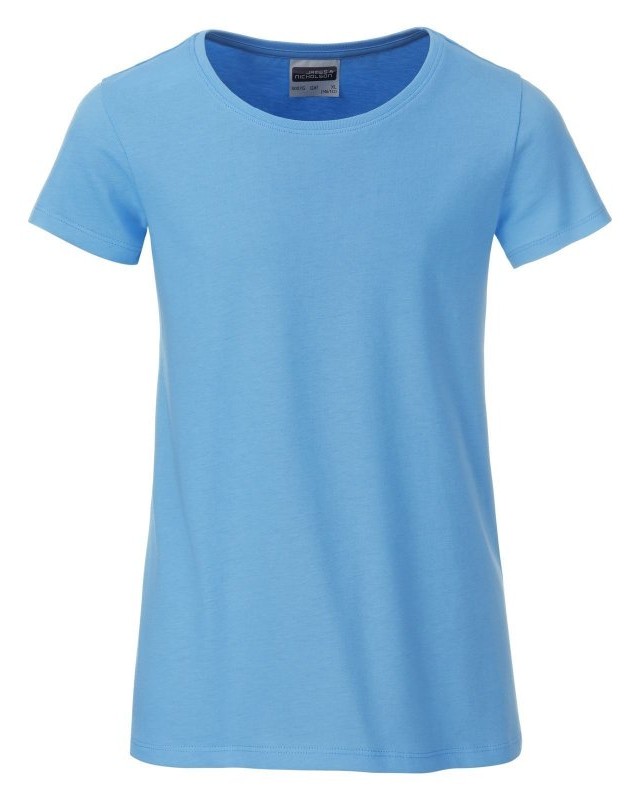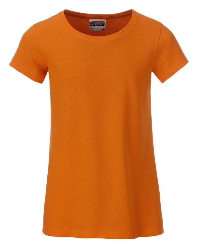 100% cotone organico. T-shirt classica da ragazza in single jersey, collo rotondo, polsini con elastane, leggermente sfiancata, etichetta removibile.