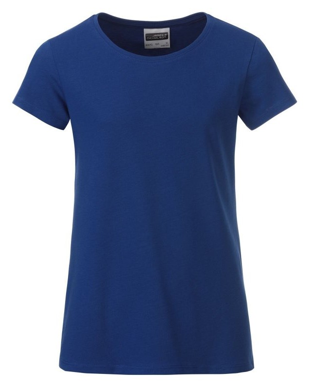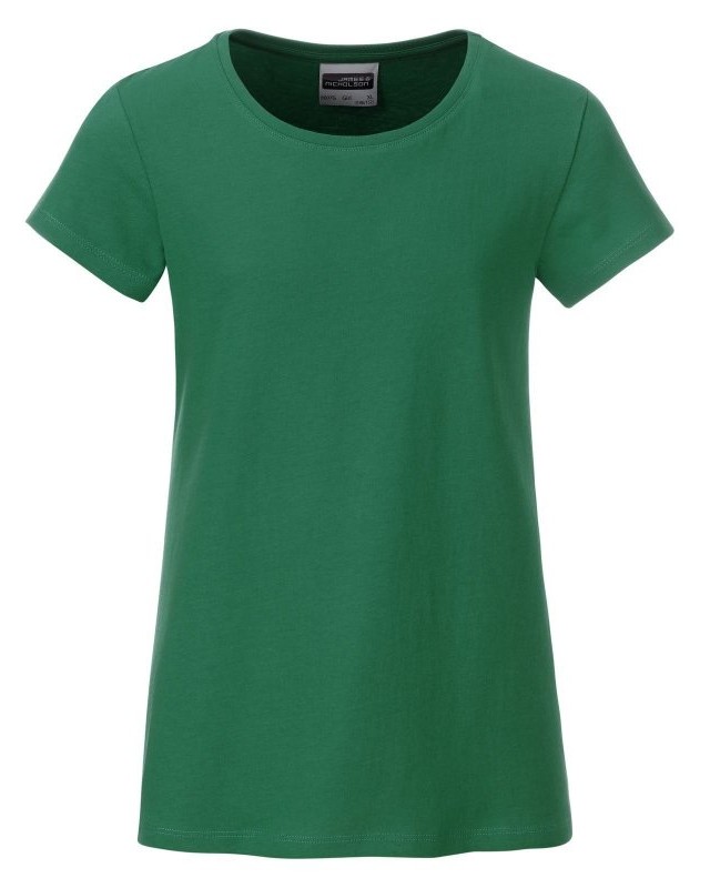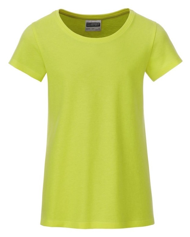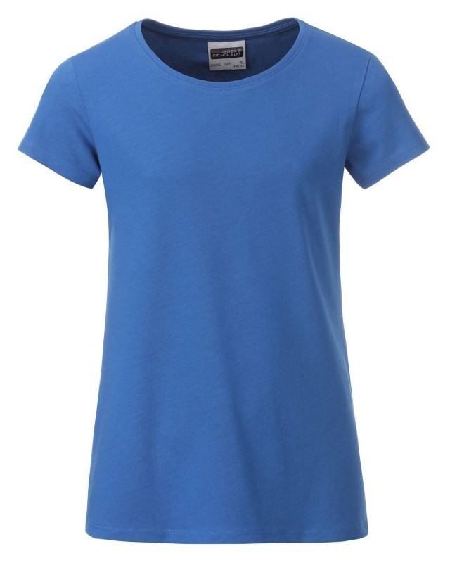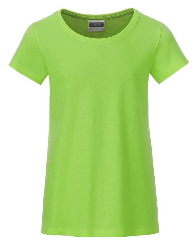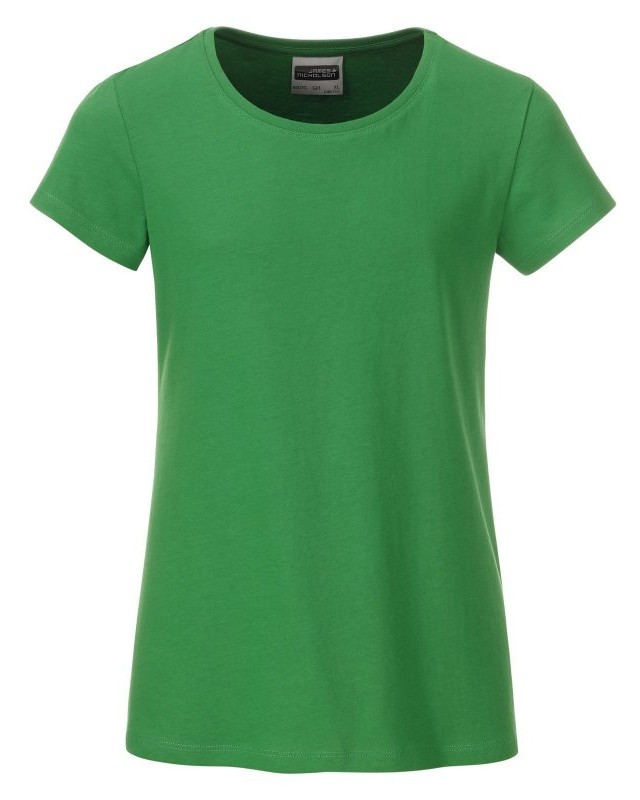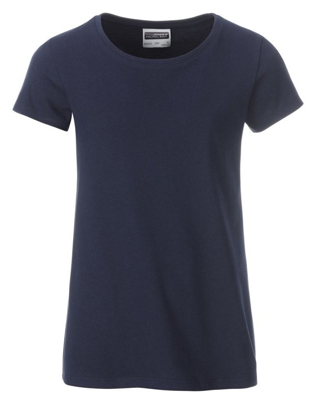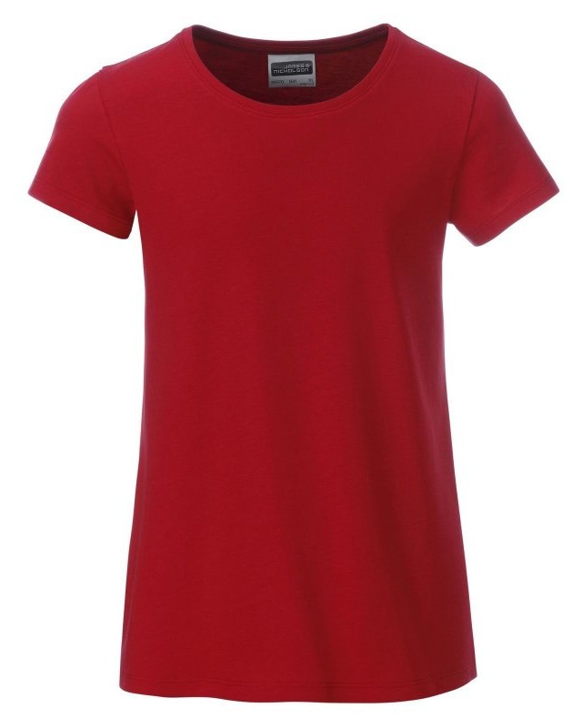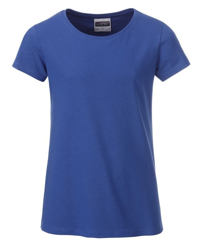 100% cotone organico. T-shirt classica da ragazza in single jersey, collo rotondo, polsini con elastane, leggermente sfiancata, etichetta removibile.
