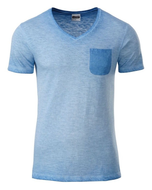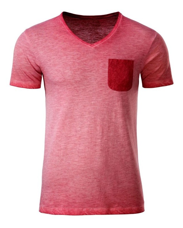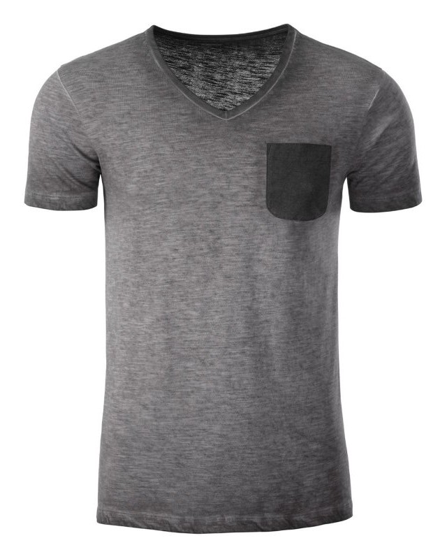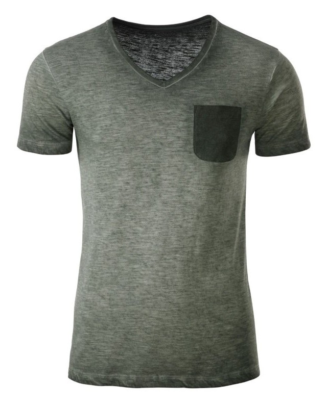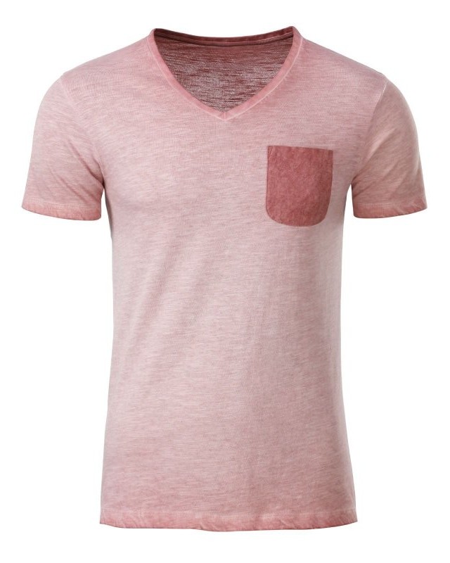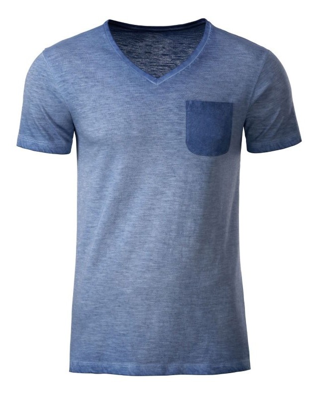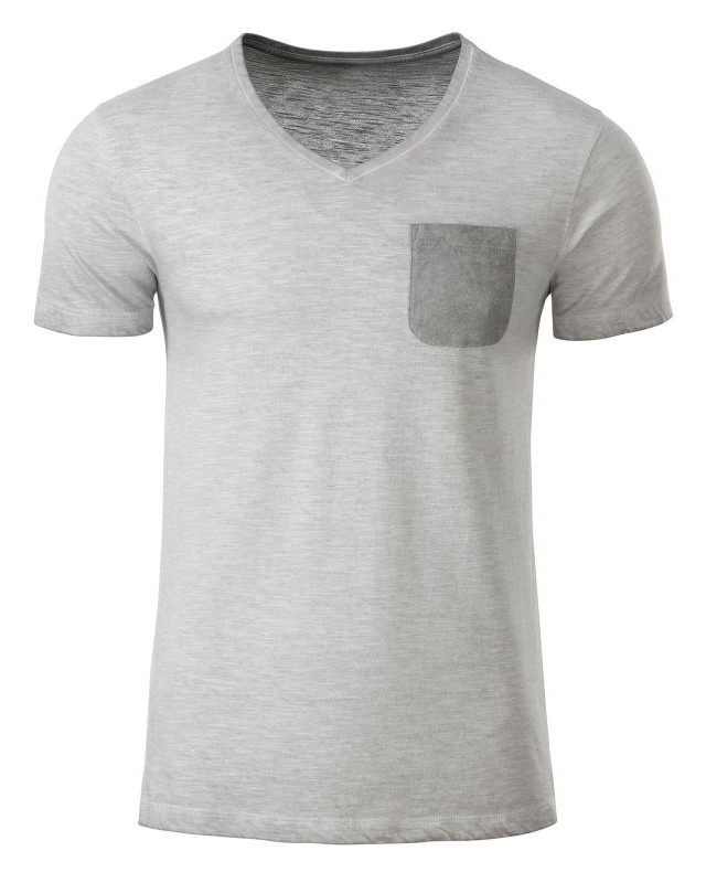 100% cotone organico fiammato. Single jersey. T-shirt manica corta set-in, scollo a V, tessuto slub, stile vintage. Polsini in elastane, taschino sul petto in colore contrastante.