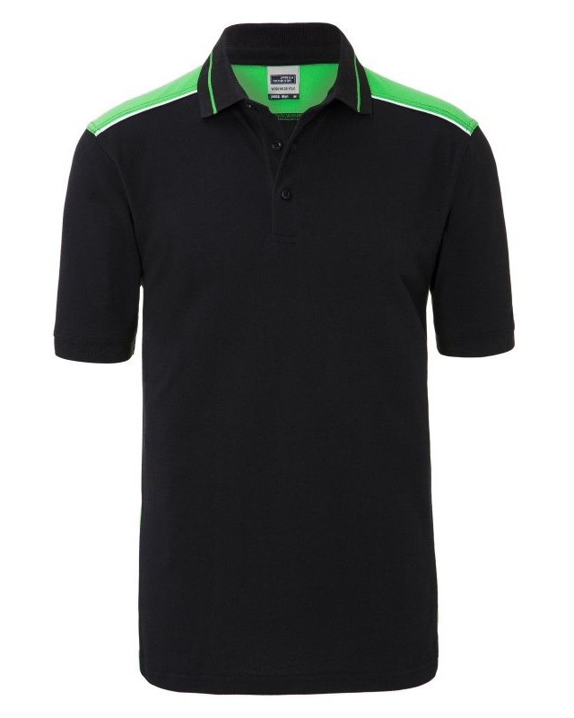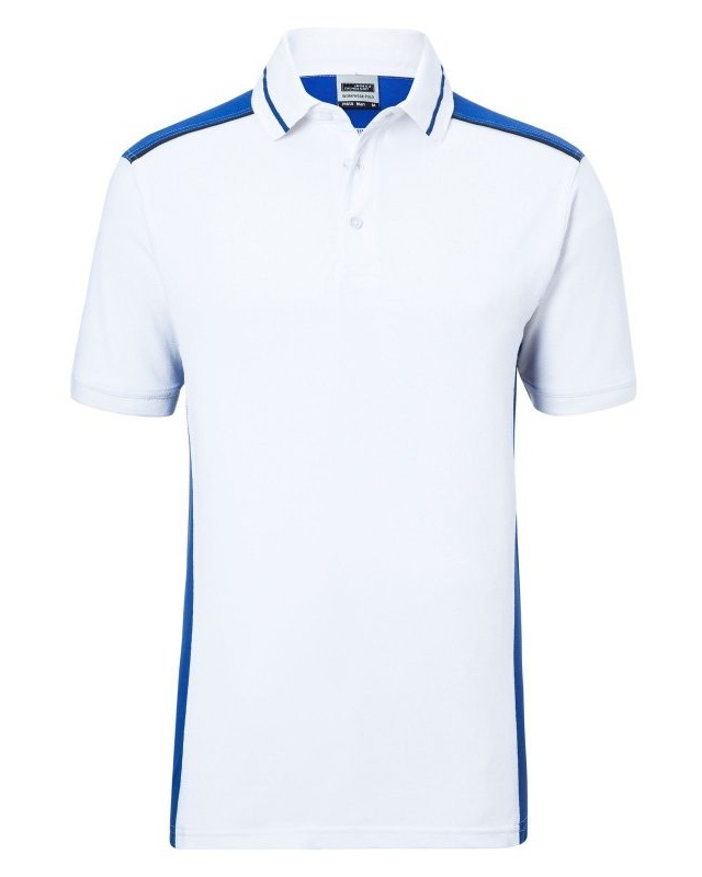 50% cotone, 50% poliestere. Polo a maniche corte set-in, perfetto mantenimento della forma e resistenza al lavaggio, polsini e colletto in maglia, inserti contrastanti nei lati e sulle spalle, colletto con strisce contrastanti, adatta per asciugatrice, chiusura con 3 bottoni, struttura con pannelli laterali in contrasto.