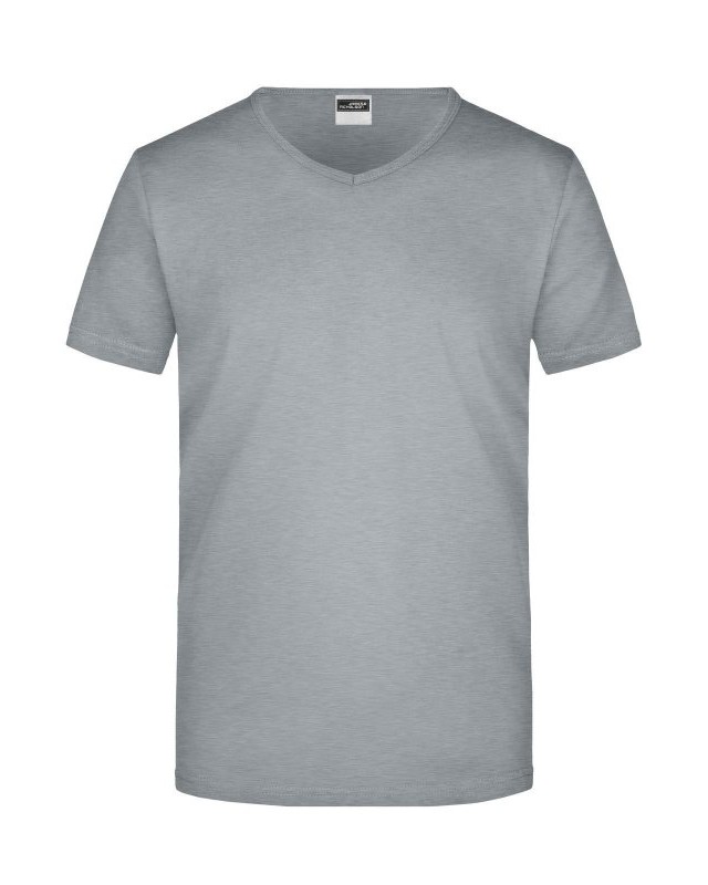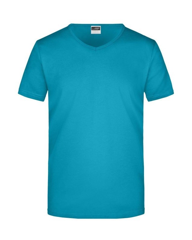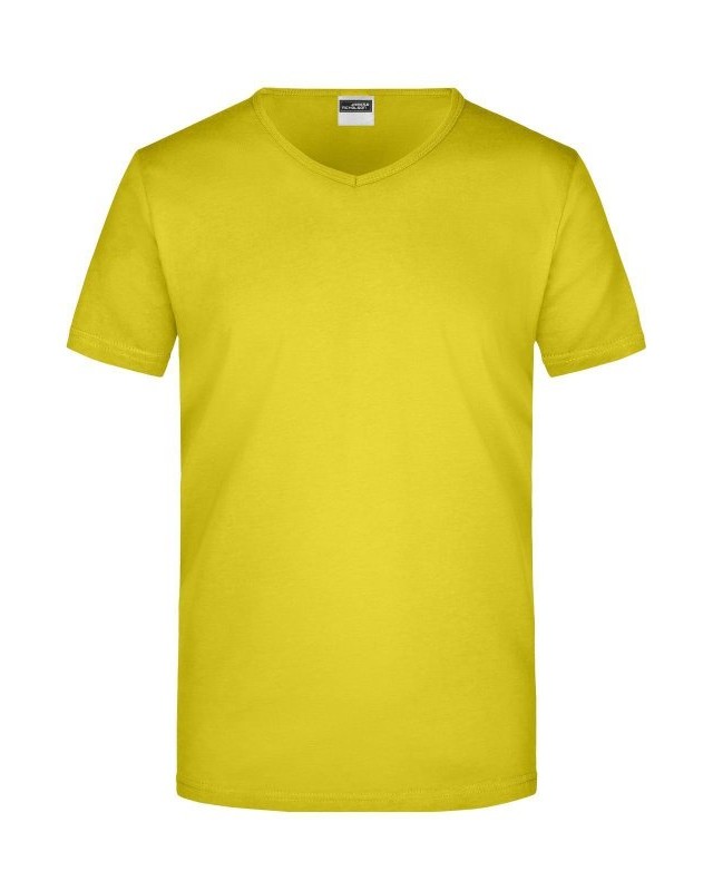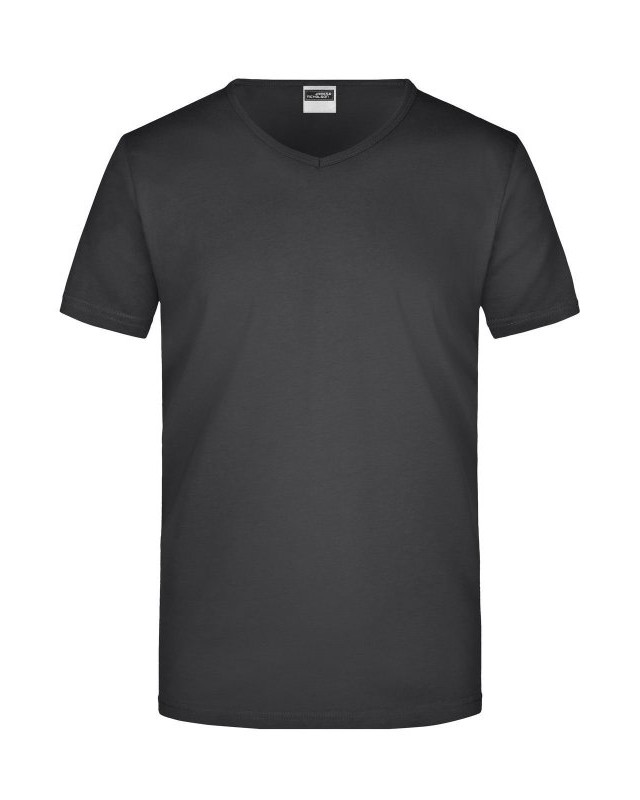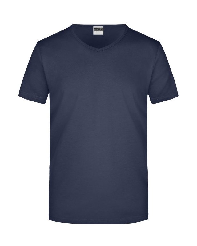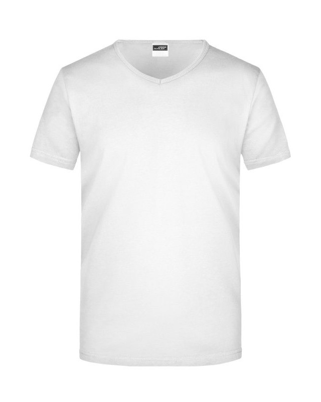 100% cotone. T-Shirt girocollo attillata Single jersey pretrattato che mantiene la forma, Taglio attillato con cuciture laterali, Sciancrata, profondo scollo a V 1 x . Tessuto esterno (160 g/m²): Manica corta, Slimfit, Collo a V.