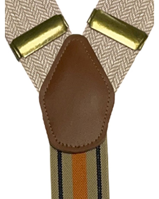100% poliestere. Bretelle in poliestere elasticizzato, inserti in vera pelle tono su tono, clip zincata. Dimensioni 3,5cm x 120cm.