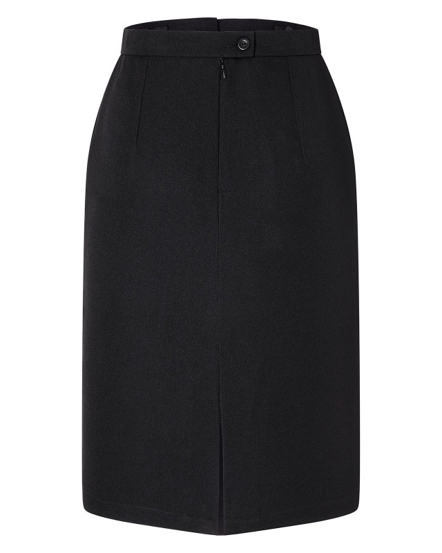 100% poliestere. Gonna da cameriera, cintura regolabile con banda elastica e bottoni, spacco di 25 cm nella parte posteriore, due tasche laterali.
