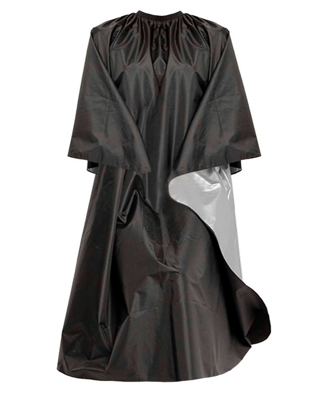 100% poliestere. Mantella da parrucchiera ideale per tintura capelli, rivestimento impermeabile in argento, con impugnature per le mani, gancio da appenderia, chiusura elastica regolabile con clip in metallo, antistatico, lavabile a 30°C. Dimensioni: 130 x 150 cm.