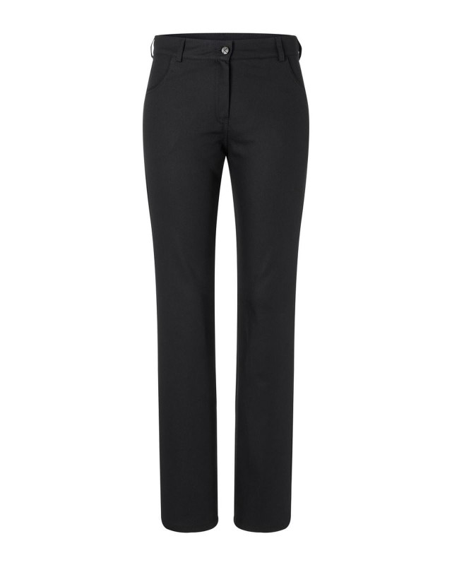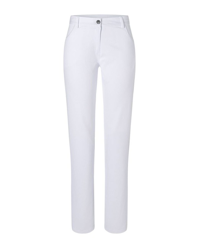 97% cotone, 3% elastolefin. Pantaloni da donna in tessuto irrestringibile, lavabile. Vestibilita' confortevole con fibra elastica, passanti per cintura, gamba leggermente svasata, due tasche laterali, due tasche posteriori. Colore bianco lavabile a 95°C.