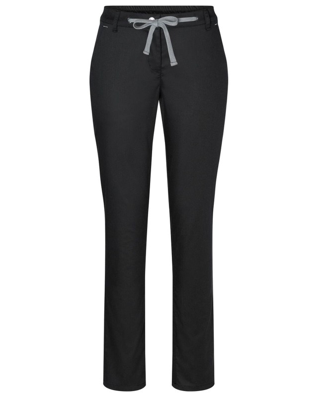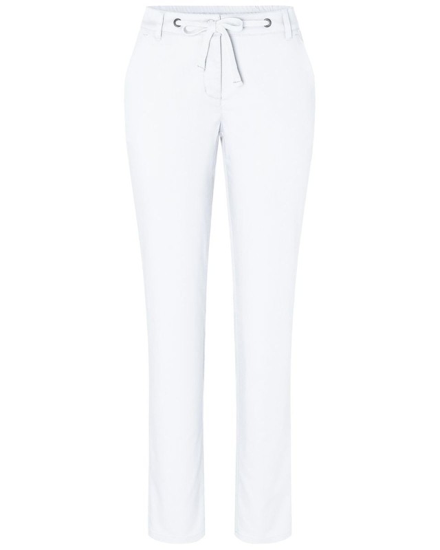 59% cotone, 39% poliestere, 2% elastan. Pantaloni informali da lavoro donna, leggeri, tessuto elasticizzato, taglio aderente, elastico flessibile e cordoncino in vita, orlo stretto, 2 tasche laterali e 2 tasche sul retro con bottoni, passanti della cintura.
