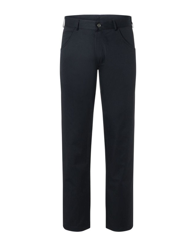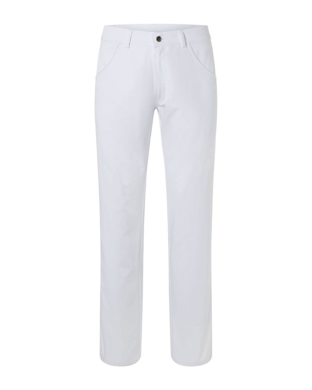65% poliestere, 35% cotone. Pantaloni in twill dal tessuto rifinito, irrestringibile, lavabile, pratico, cinque tasche, gamba dritta, passanti per cintura. Colore Bianco lavabile a 95°C.
