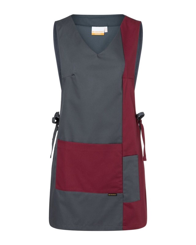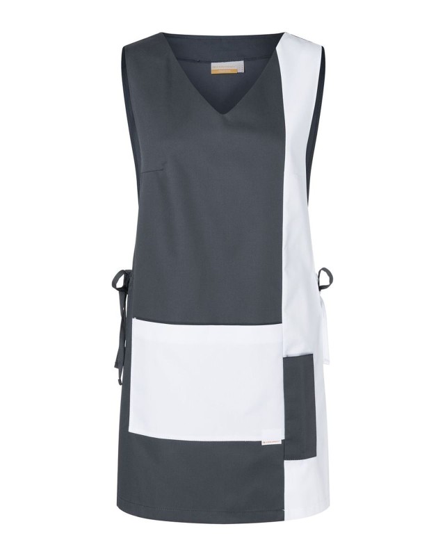 65% poliestere, 35% cotone. Tunica in tessuto rifinito e irrestringibile. Busto con pence, due tasche frontali con cuciture nascoste, adatta al lavaggio industriale, laccetti laterali.