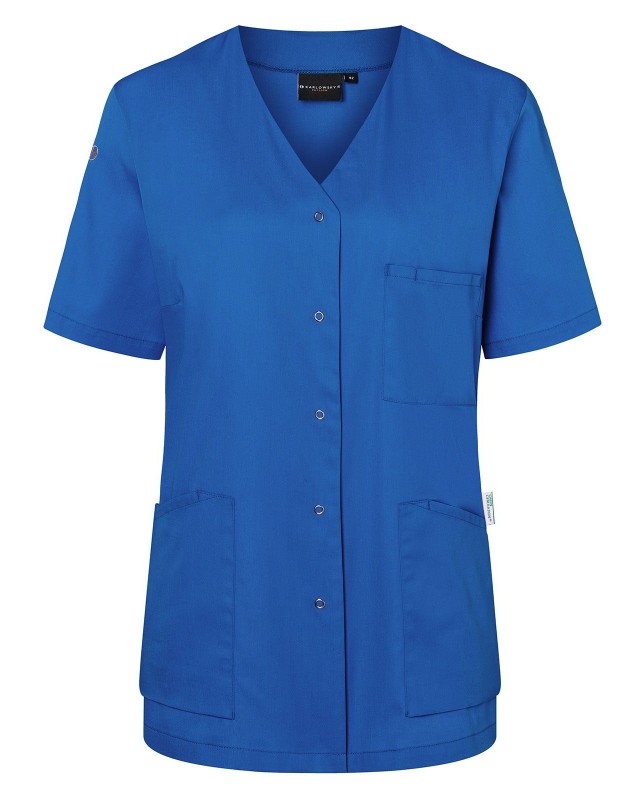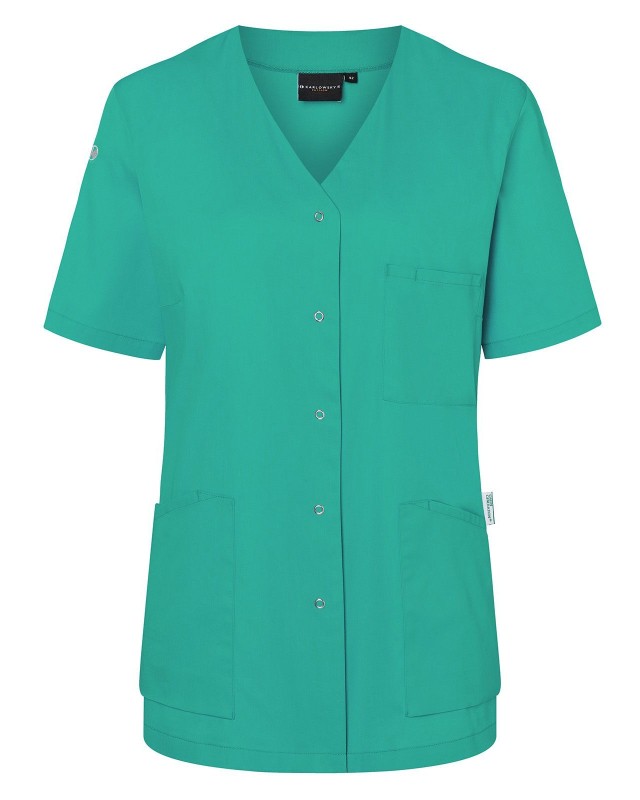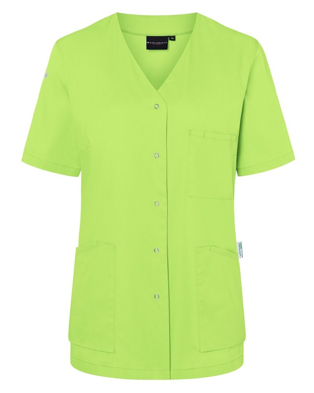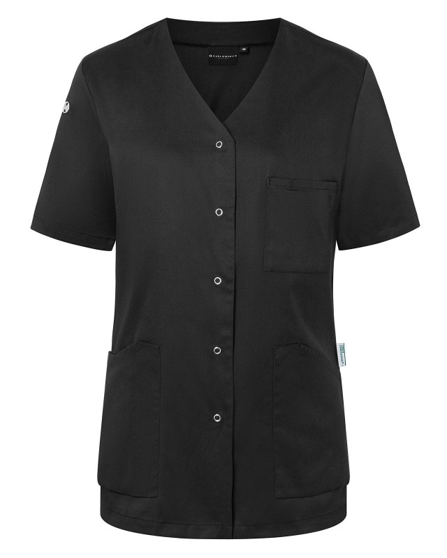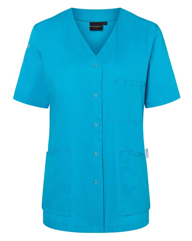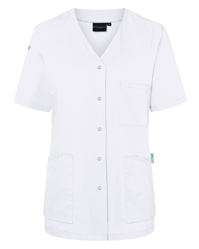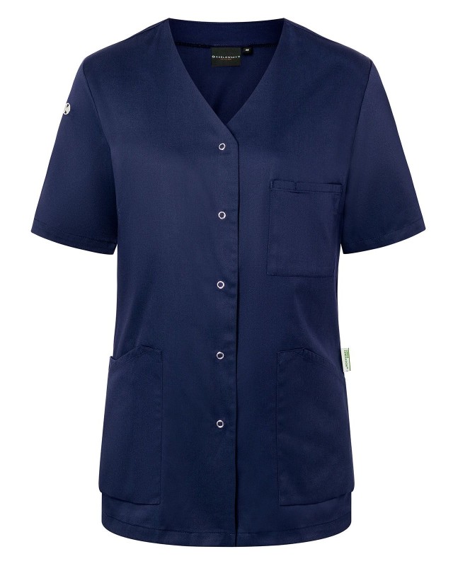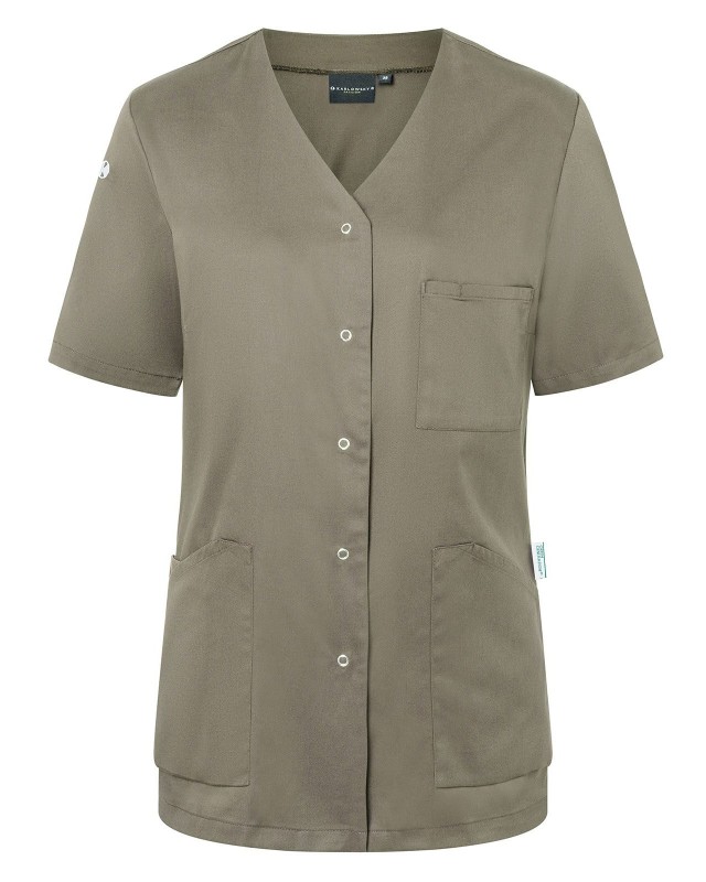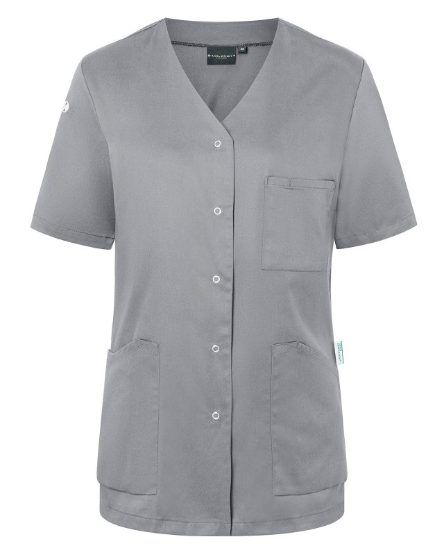 65% poliestere riciclato, 35% cotone. Camice da donna moderno e sostenibile con maniche corte e scollo a V, leggermente sciancrato, 2 tasche laterali con una tasca interna nascosta a destra, passante per porta chiavi nella tasca laterale, 1 taschino porta penne sul petto a sinistra, 5 bottoni automatici.