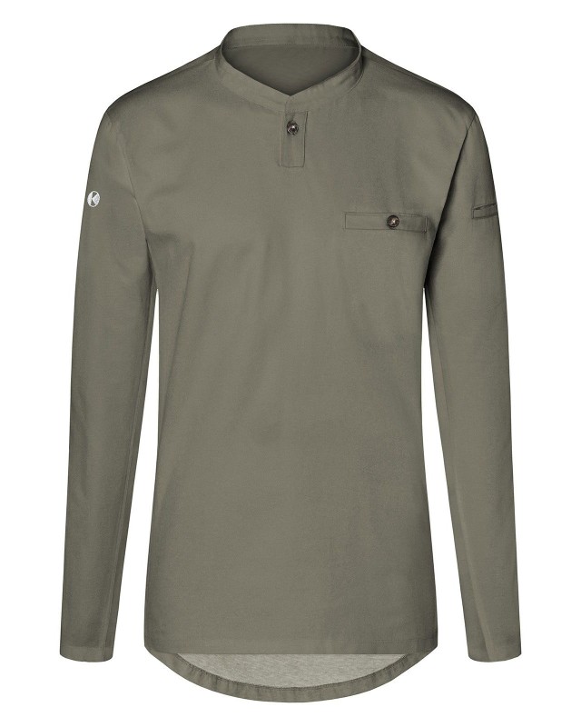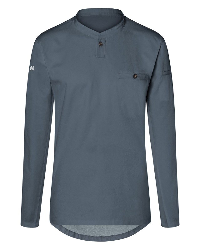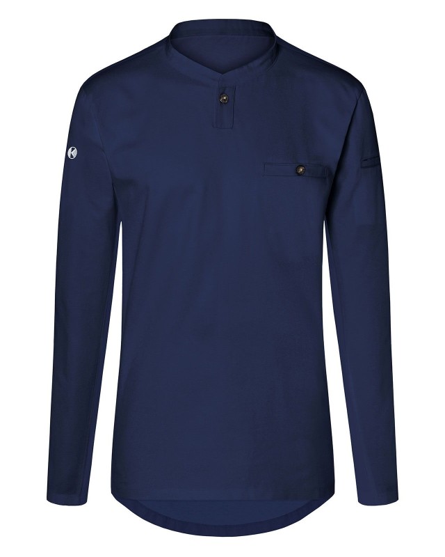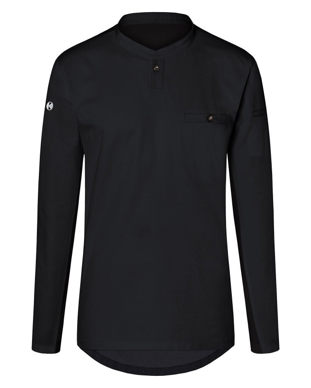 Lato anteriore: 60% cotone 40% poliestere, Lato posteriore: 100% jersey piqué poliestere. Moderna t-shirt da lavoro a maniche lunghe, slim fit, colletto alto e abbottonatura corta, taschino con bottone, a filetto su petto e manica.