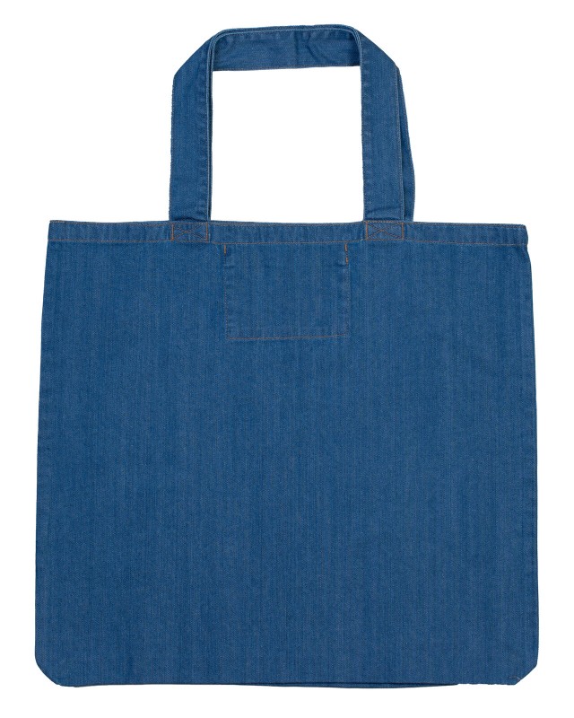 100% cotone organico. Ampia shopper in denim con tasca interna, base rinforzata, lunghi manici, cuciture rinforzate, etichetta a strappo. Dimensioni: 50x46 cm.