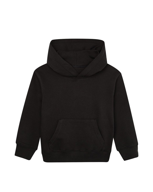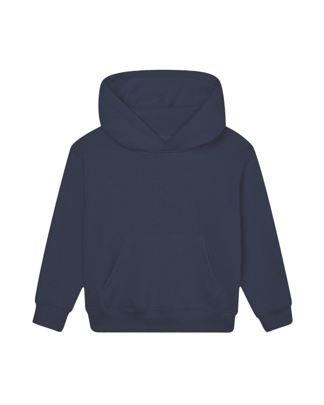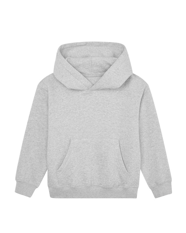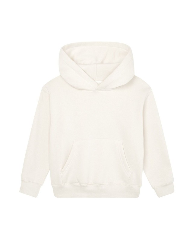80% cotone (organico o in conversione), 20% poliestere riciclato, 280 g/m2. Felpa da bambino vestibilità unisex, maniche set-in, interno felpato, cappuccio doppio strato, interno felpato, nastro di rinforzo al collo a contrasto. Polsini e orlo a costine, tasca a marsupio frontale. Etichetta taglia removibile sul collo. Etichetta con istruzioni di lavaggio in cotone organico.