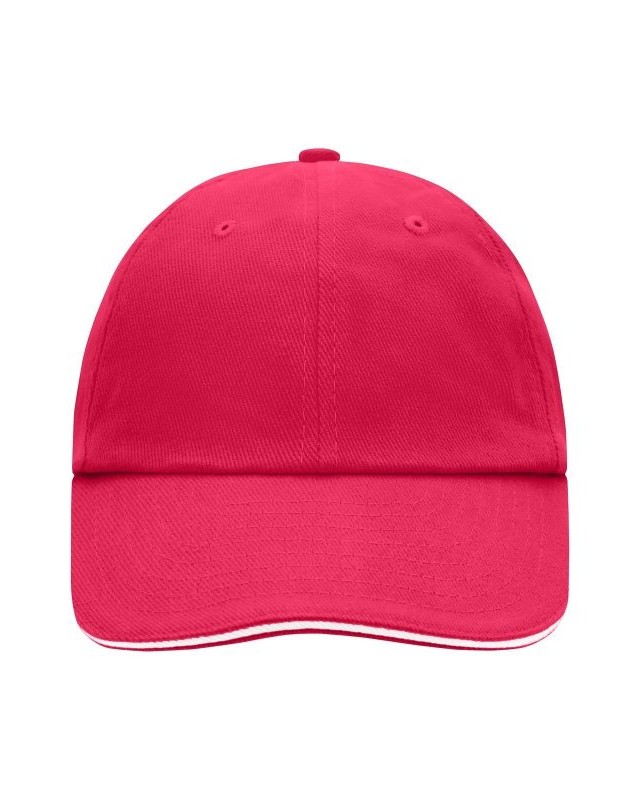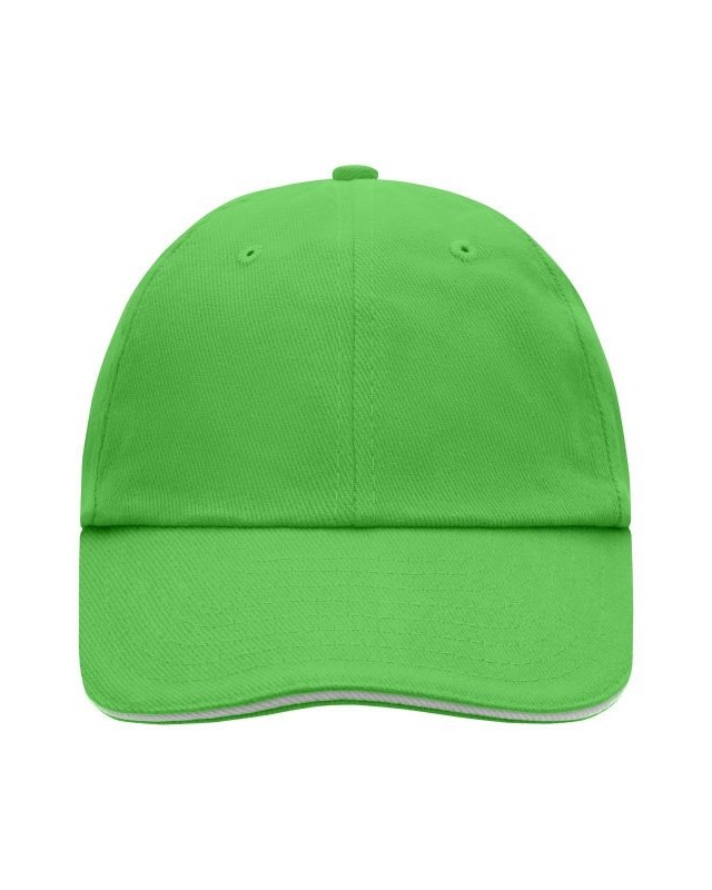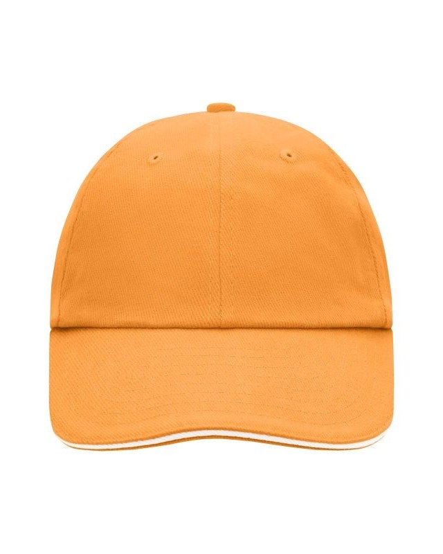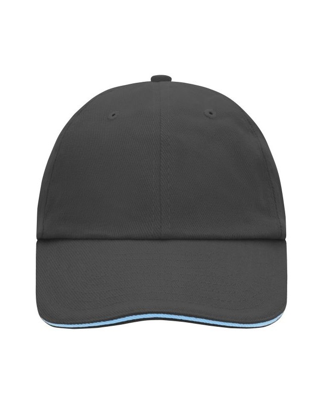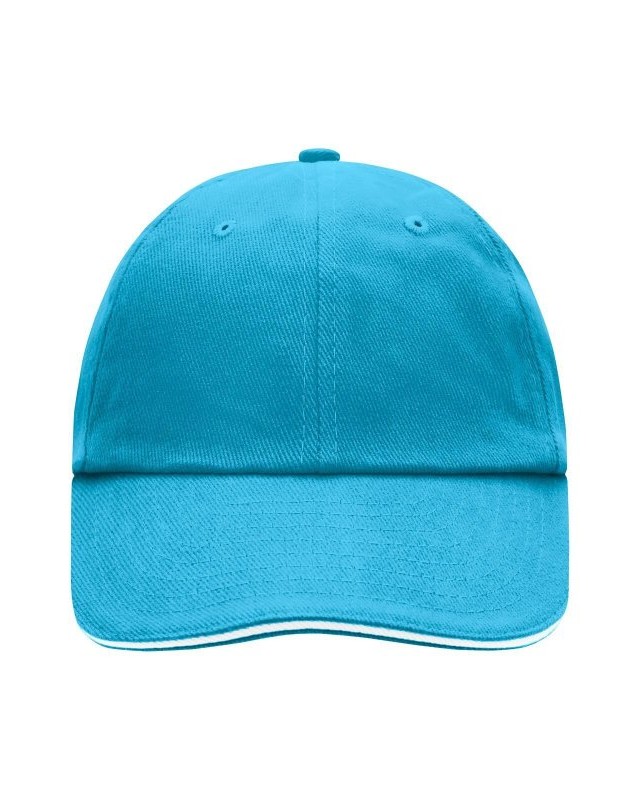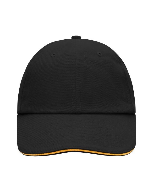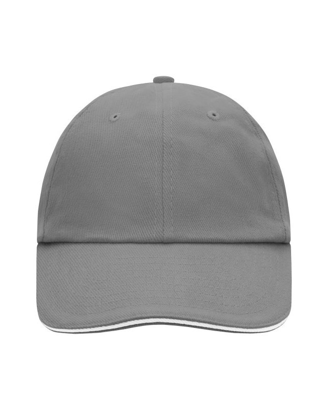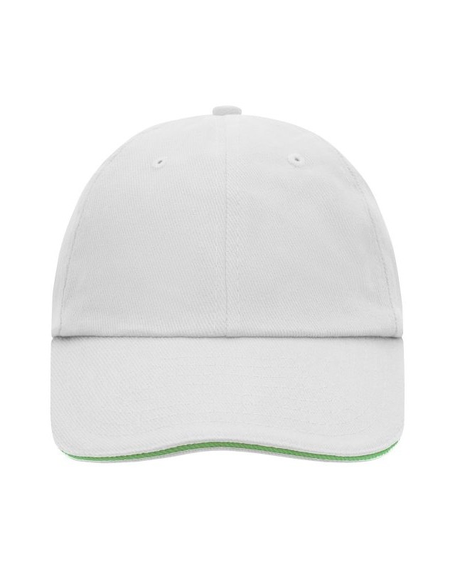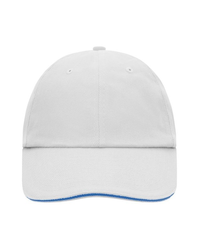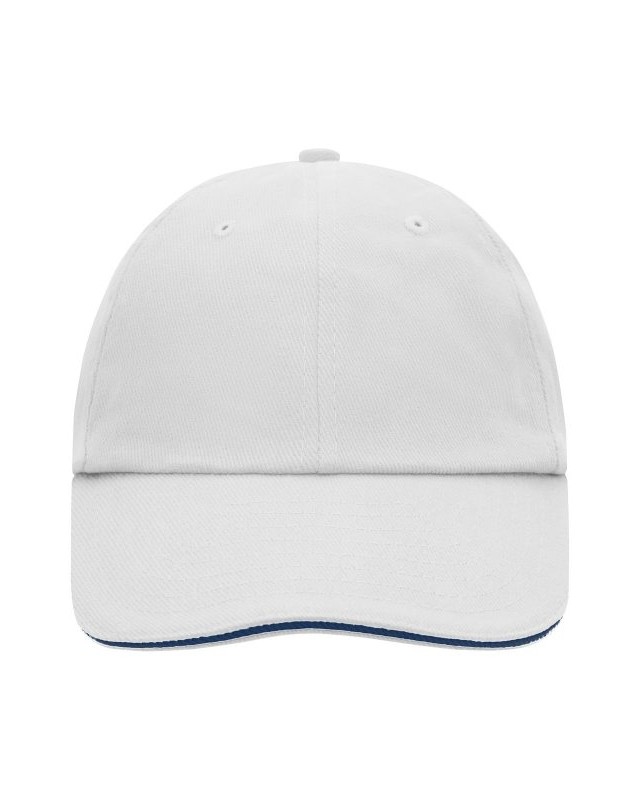 100% cotone. Cappello classico con sandwich a contrasto 6 fori traspiranti imbastiti, 8 cuciture decorative sulla visiera, Taglio aderente, Fascetta tergisudore imbottita in satin, Disponibile anche senza sandwich, vedi articolo MB6111, Fibbia in metallo argentato e asola ricamata, Cotone spazzolato forte, ruvido, policromo, Sandwich, Taglio aderente.