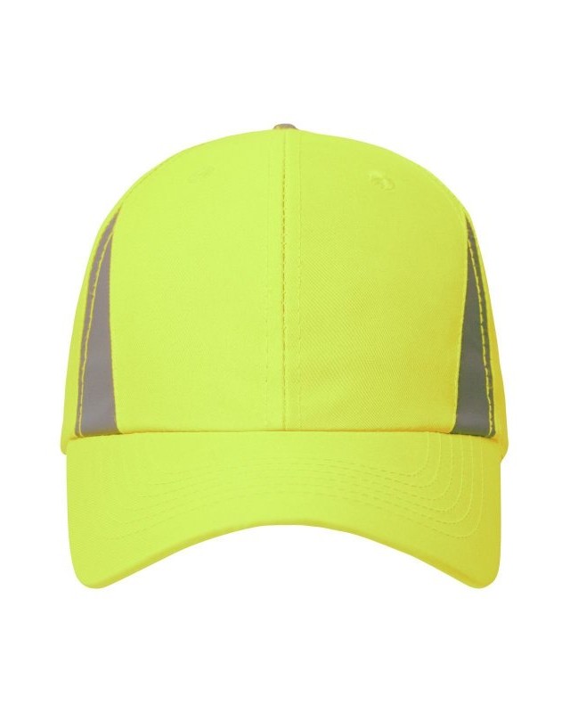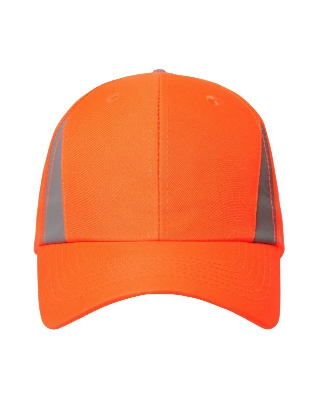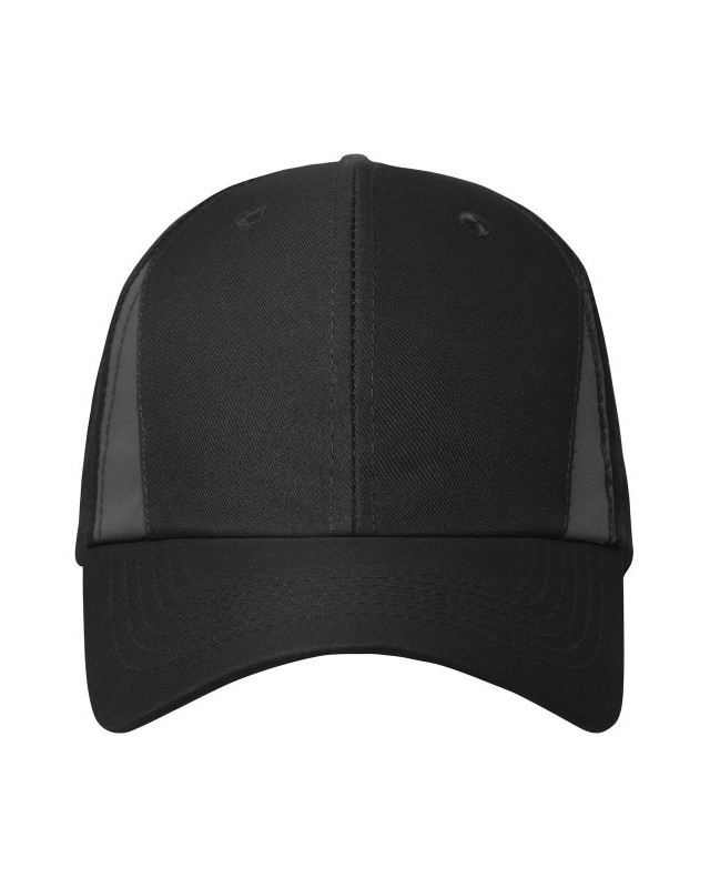 100% poliestere. Safety cap con 4 fori di ventilazione ricamati, 6 cuciture decorative sulla visiera, inserti riflettenti sui pannellli, pannelli frontali laminati, chiusura in velcro, taglia unica.