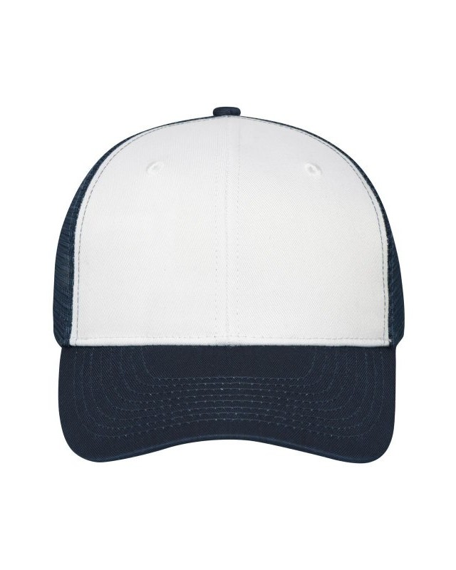 65% poliestere 35% cotone, mesh: 100% poliestere. Berretto 6 pannelli in policotone, 8 cuciture decorative sulla visiera, 2 fori di ventilazione ricamati sui pannelli frontali, fascia interna in raso foderata, chiusura automatica per la regolazione della taglia.