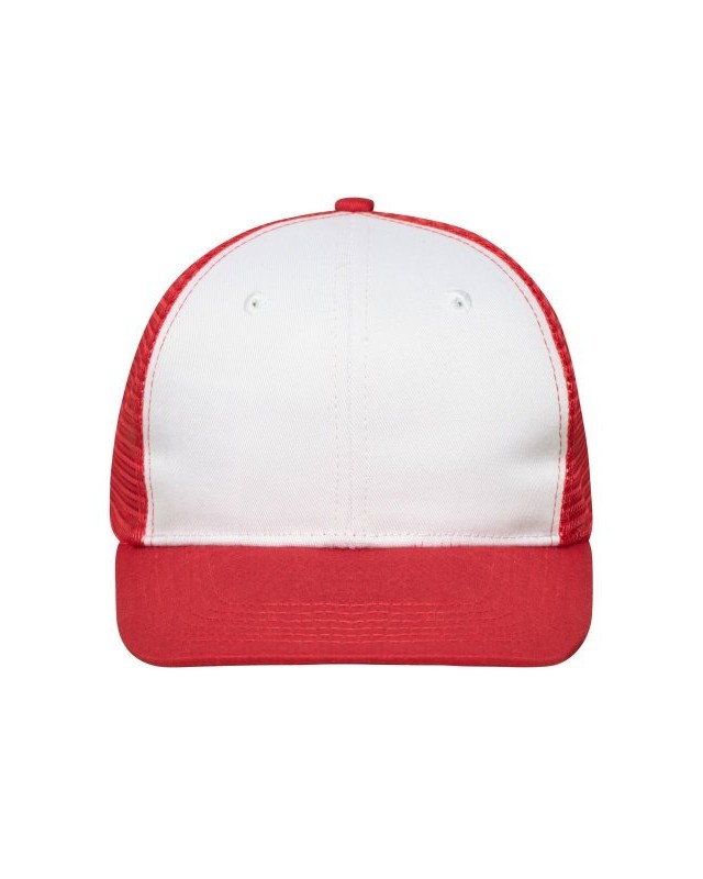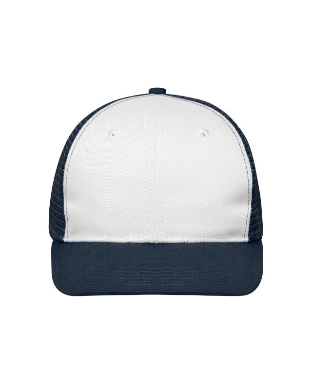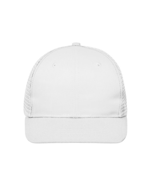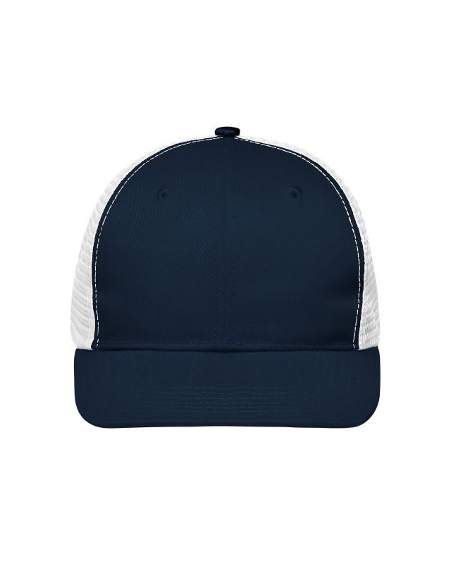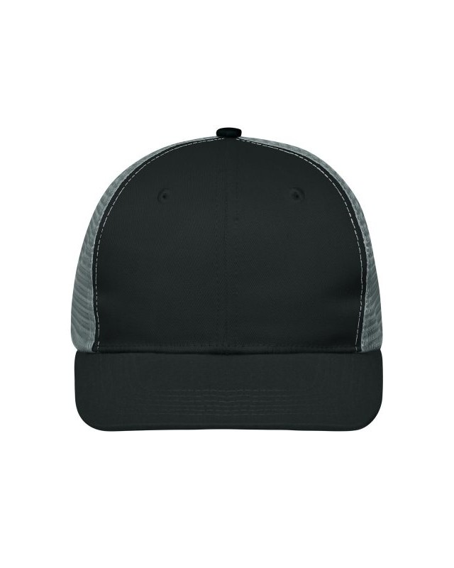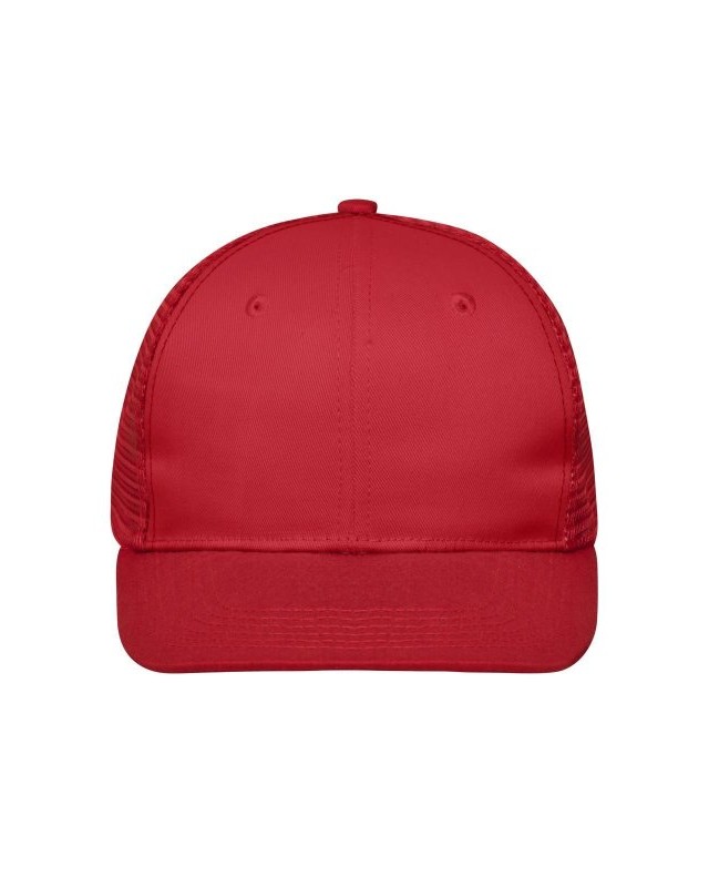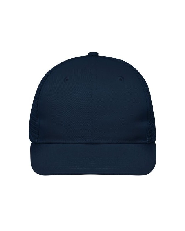 65% poliestere 35% cotone, mesh: 100% poliestere. Cappellino a 6 pannelli con visiera piatta in policotone, 8 cuciture decorative sulla visiera, 2 fori di ventilazione ricamati sui pannelli frontali, fascia interna foderata in raso, chiusura a scatto e bottone automatico per la regolazione della taglia.