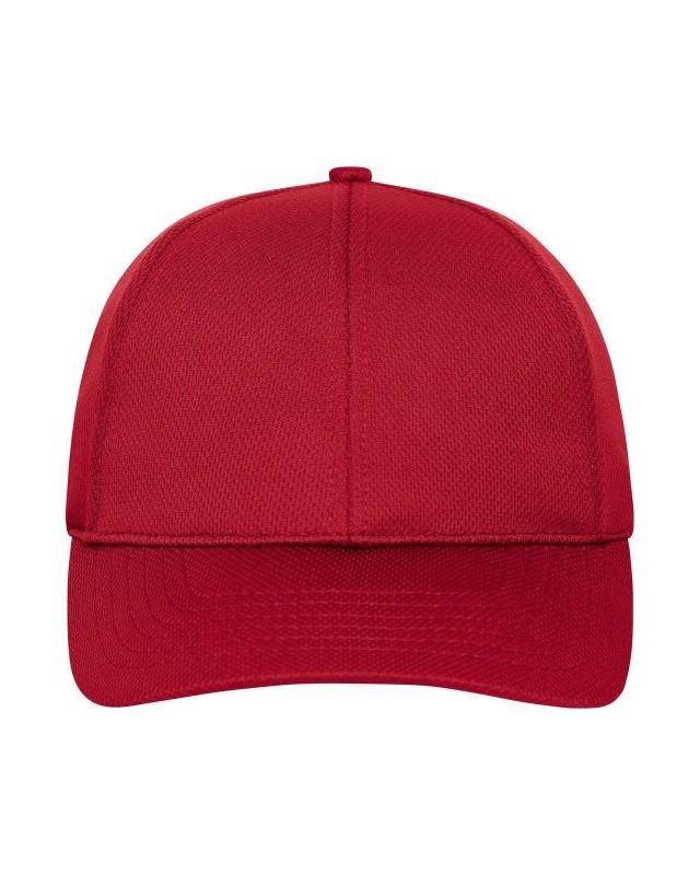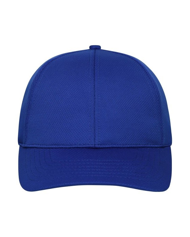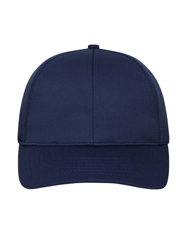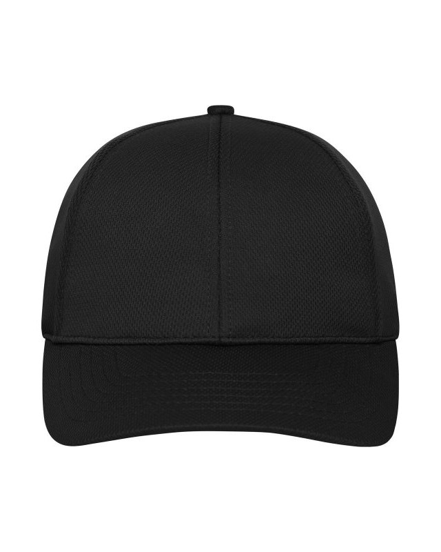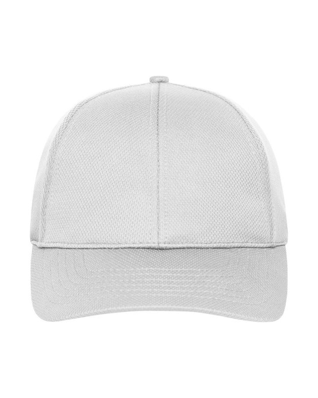 100% poliestere. Cappellino sportivo a 6 pannelli realizzato in morbida rete, 4 fori di ventilazione ricamati, 6 cuciture decorative sulla visiera, pannelli frontali laminati, fascia interna foderata in raso, chiusura a strappo.