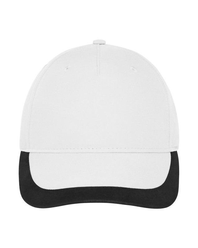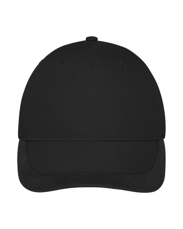 100% poliestere. Cappellino sportivo a 5 pannelli realizzato in morbida microfibra, antivento e idrorepellente, ampia striscia decorativa sulla visiera, pannelli frontali laminati, 4 fori di ventilazione ricamati sui pannelli posteriori, piacevole da indossare grazie alla fascia in raso foderata, chiusura a clip in argento opaco con occhiello in metallo.
