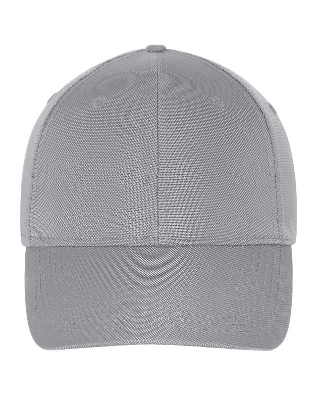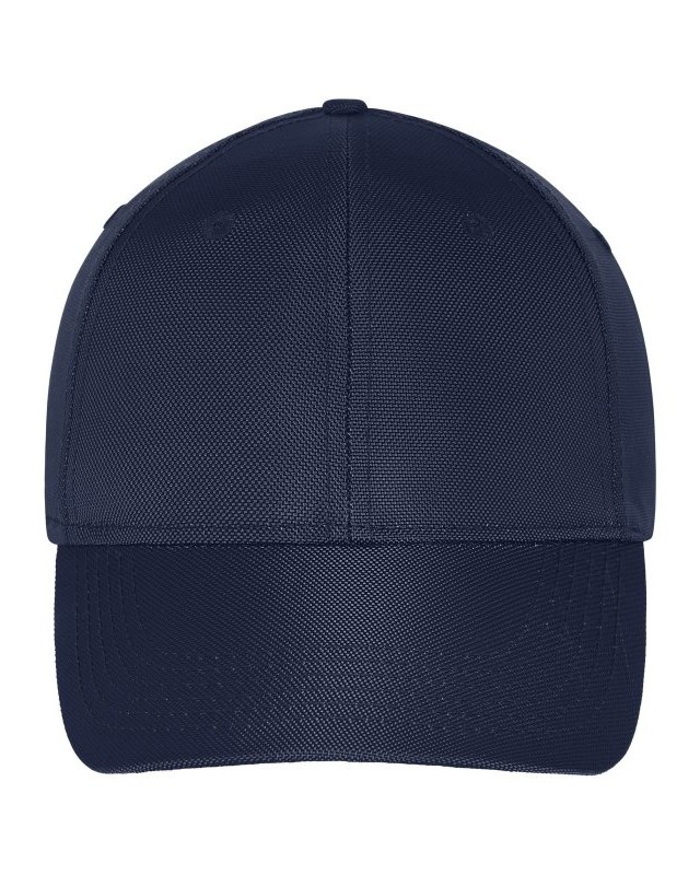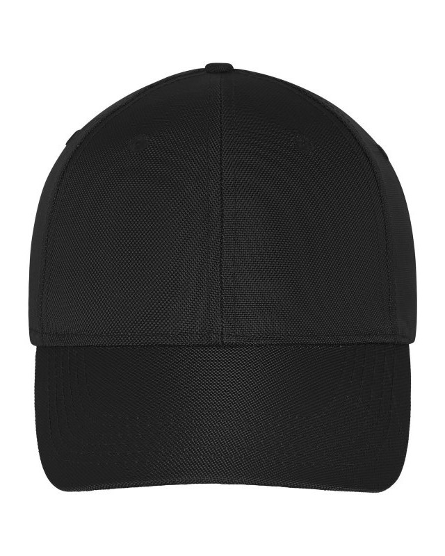 100% poliestere. Cappellino con 6 pannelli frontali laminati, 6 fori per l’aria ricamati, 6 cuciture decorative sulla visiera, fascia antisudore foderata, chiusura a clip in argento opaco con occhiello in metallo.