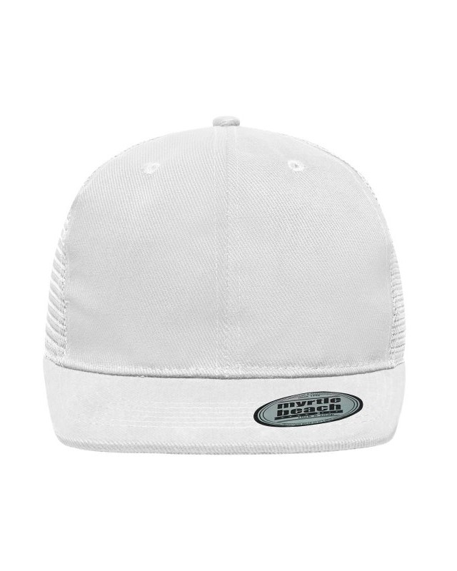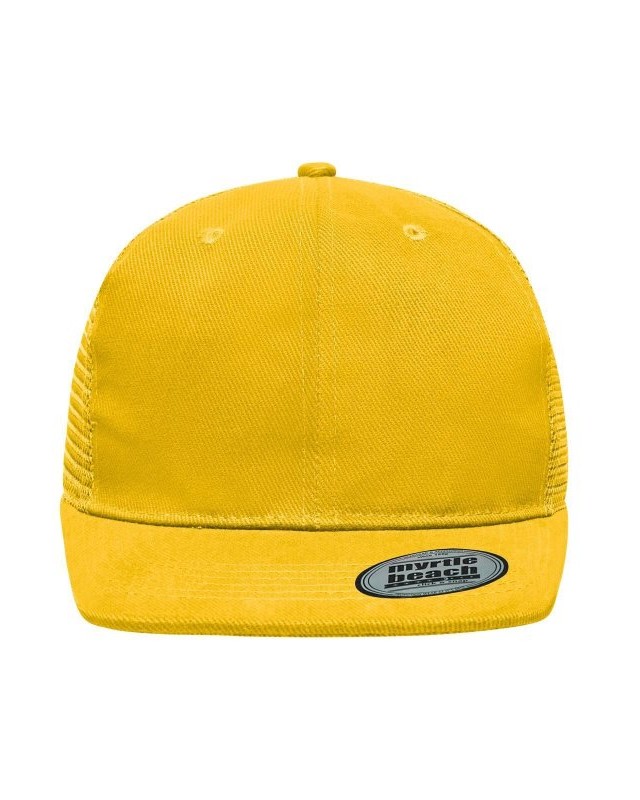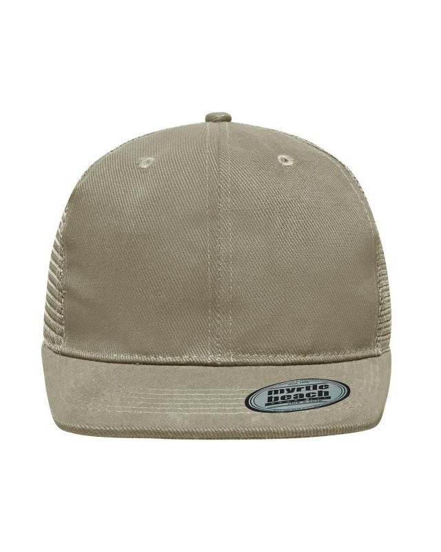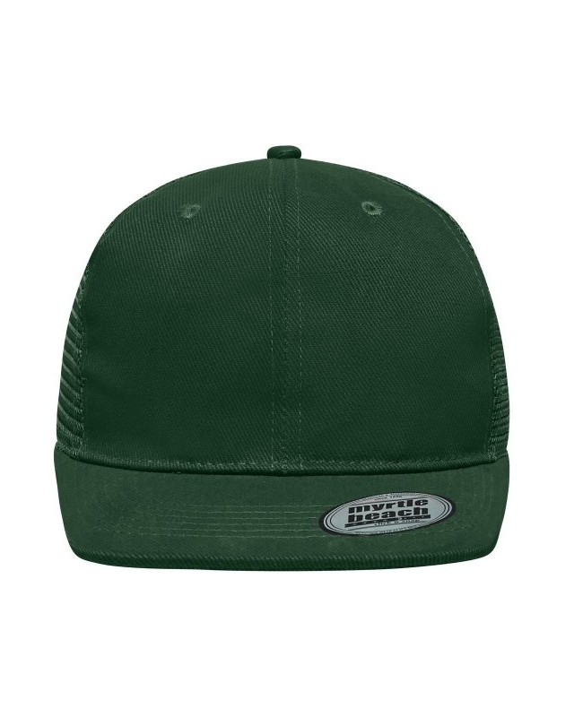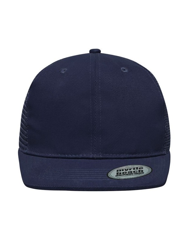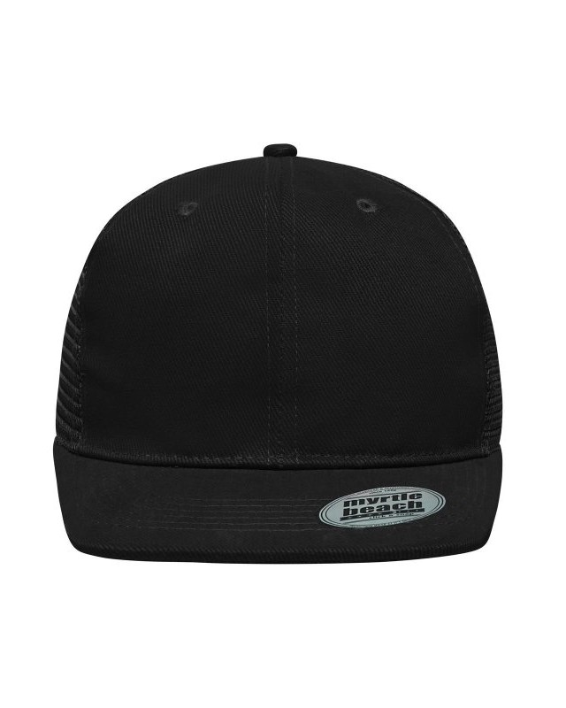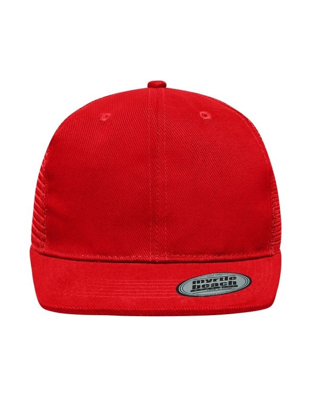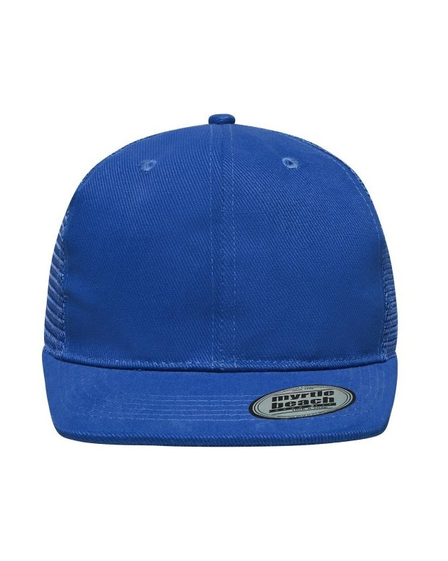 Mesh: 100% poliestere, Visiera e pannello frontale: 100% cotone. Cappello a rete a 6 pannelli con visiera piatta 6 cuciture decorative sulla visiera, 6 fori di aerazione ricamati, Fascetta tergisudore in cotone, Etichetta sulla visiera, Regolazione taglia con chiusura ""click & snap"", Cotone spazzolato.