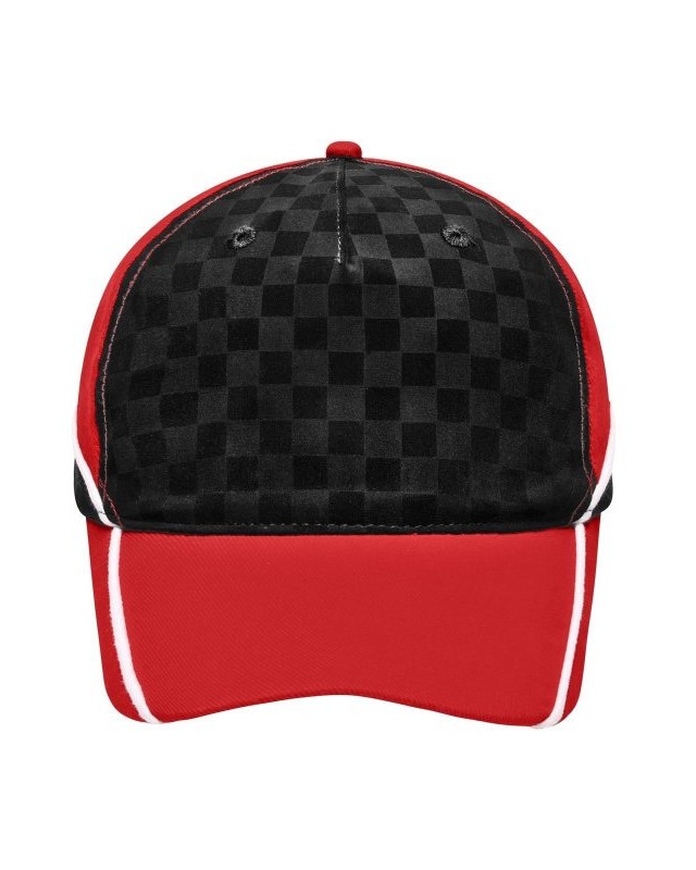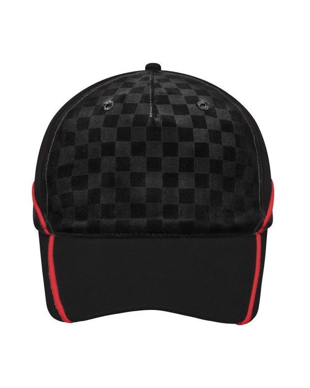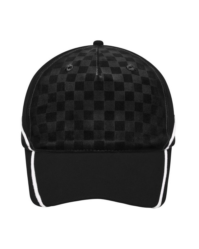 Tessuto esterno: 100% cotone, Parti in rilievo: 100% poliestere. Sontuoso cappello a 5 pannelli in stile racing Pannello frontale, inserti laterali e chiusura scolpita con disegno a scacchiera, Cordino decorativo sulla visiera, lungo la parte laterale, nei pannelli posteriori e sulla chiusura , 6 fori di ventilazione ricamati, Fascetta tergisudore imbottita in satin,Chiusura in velcro, Cotone spazzolato, ruvido, Velcro, policromo, Sandwich.